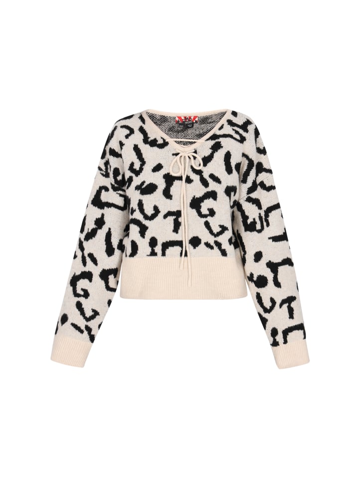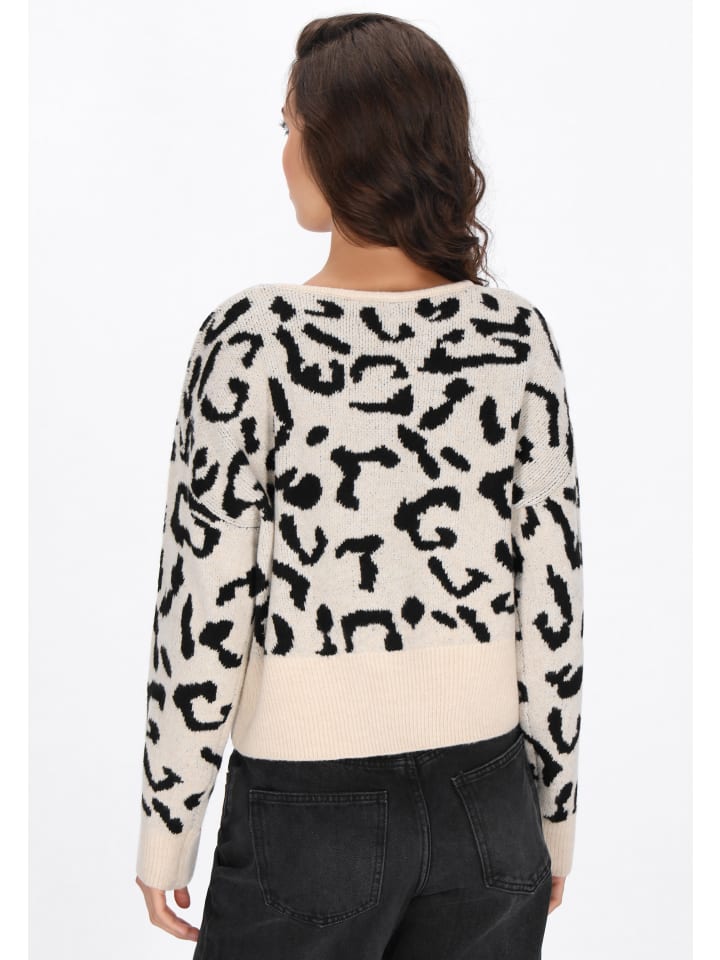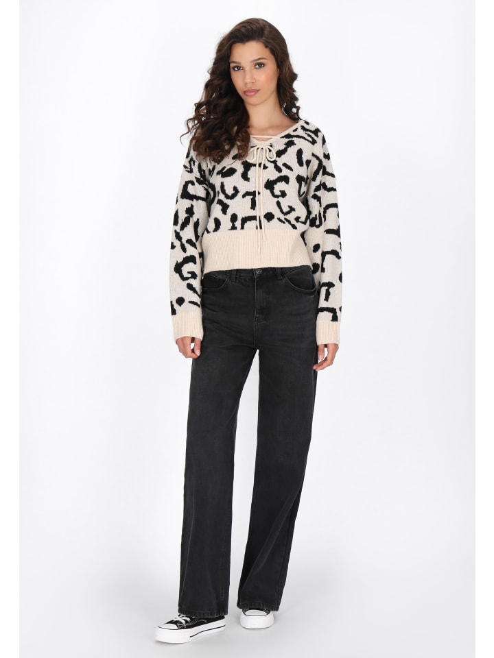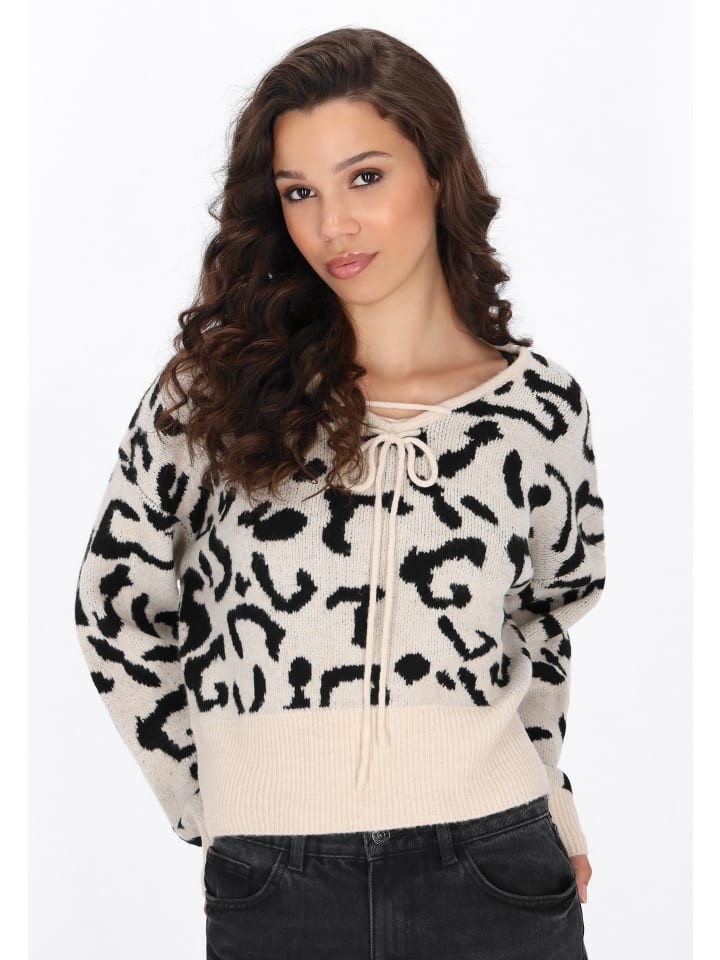 Выразите свой стиль и характер в этом трикотажном свитере из коллекции MyMo Rocks! Свободный крой обеспечивает полный комфорт и непринужденный вид. V-образный вырез и спущенные плечи подчеркивают модный повседневный стиль. Этот свитер из мягкого трикотажа с эффектным леопардовым принтом добавит нотку изысканности любому образу. Завязка на горловине добавит изящности. Идеальная повседневная вещь - удобная, уютная и с модной ноткой.