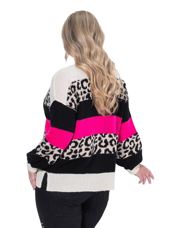 Свободный свитер из мягкой тонкой ткани с блочными полосками и леопардовым принтом. V-образный вырез, спущенная линия плеча, длинные рукава, ребристые манжеты.