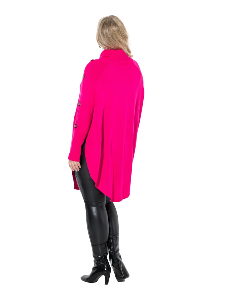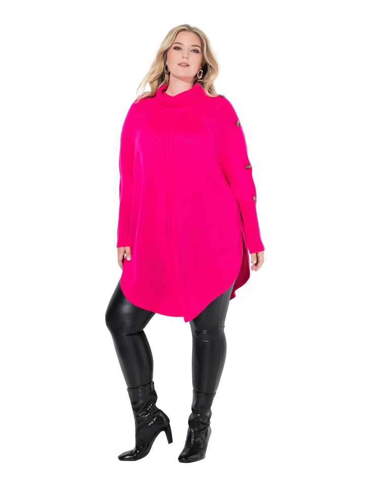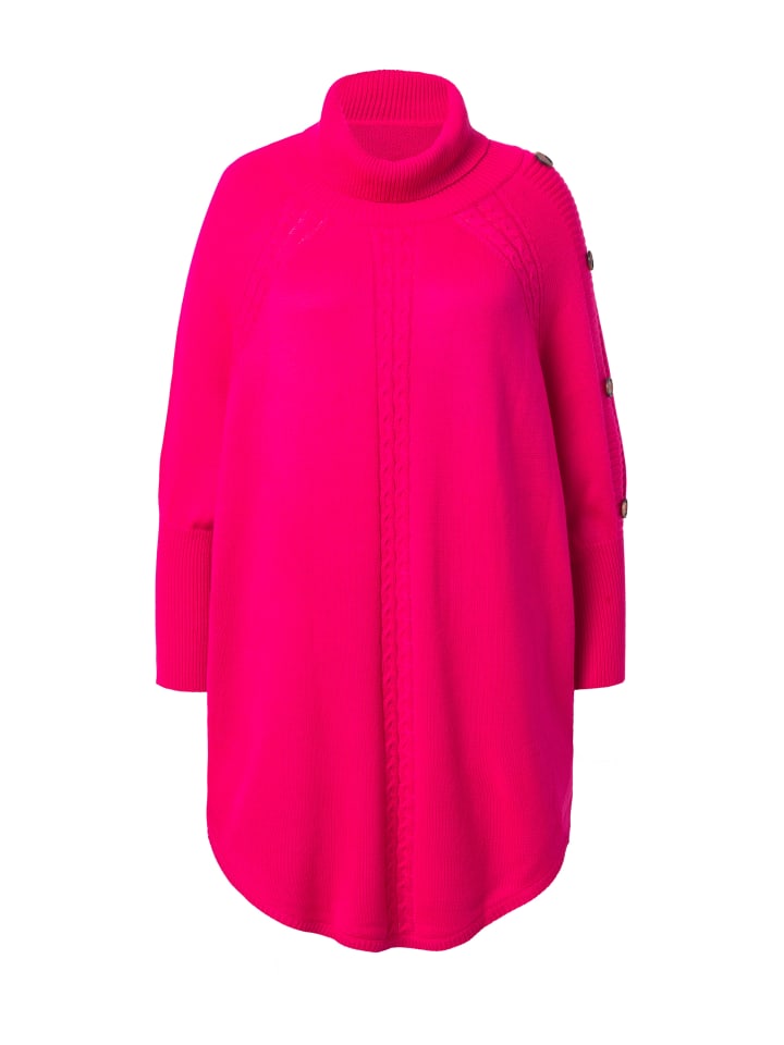 Свободный свитер-пончо из мягкой тонкой пряжи с узором «косы». Широкие спущенные плечи, V-образный вырез, закругленный низ, открытые бока. Длинные рукава с декоративной планкой на пуговицах и ребристыми манжетами.