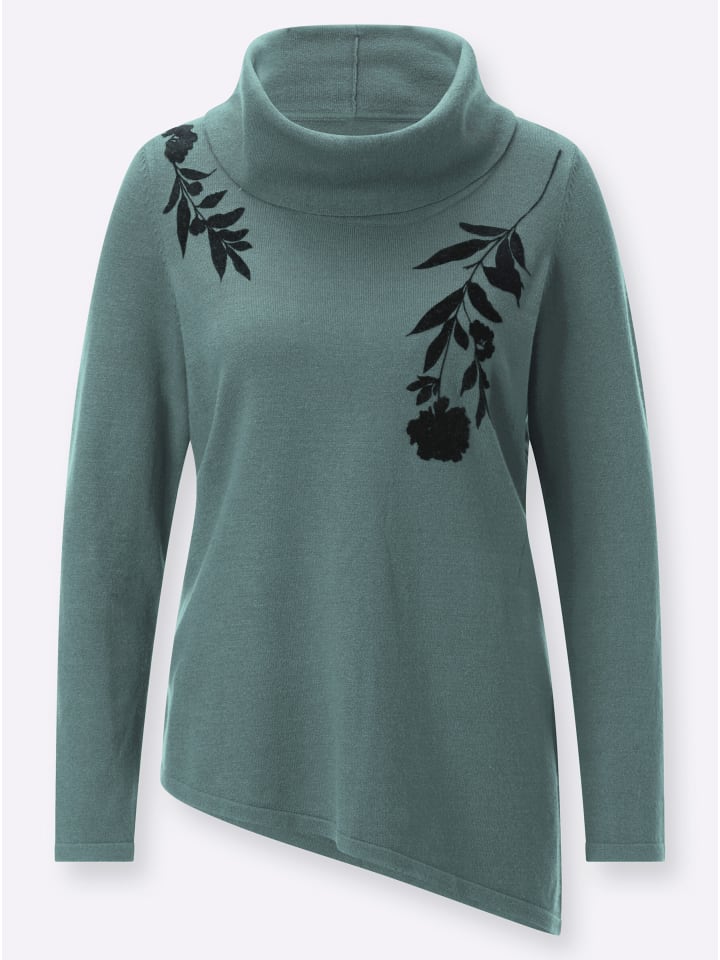 Прекрасный свитер тонкой вязки с удобным, свободным воротником-стойкой и длинными рукавами. Бархатистый ворсистый рисунок спереди. Асимметричный подол подчеркивает фигуру. Тщательно связан по фигуре. Изготовлен из вискозы Lenzing ECOVERO.