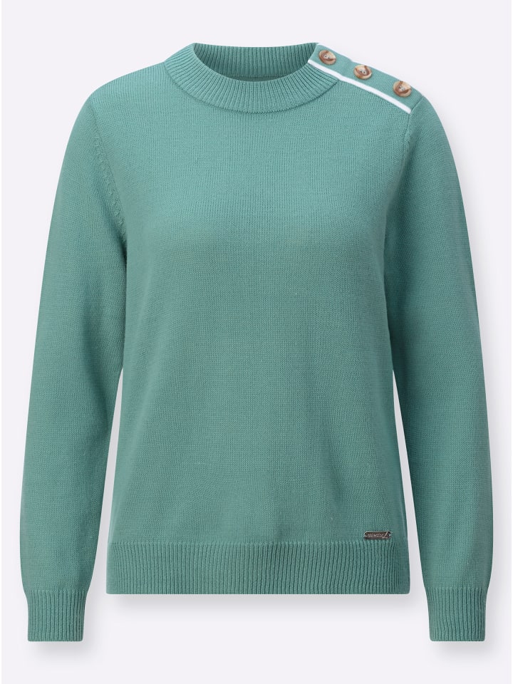 Свитер с декоративными пуговицами с роговым эффектом и контрастными полосками на левом плече. Круглый вырез, длинные рукава и прямой подол. Ребристые манжеты и подол. Идеальная посадка по фигуре. Изготовлено из переработанного полиэстера.