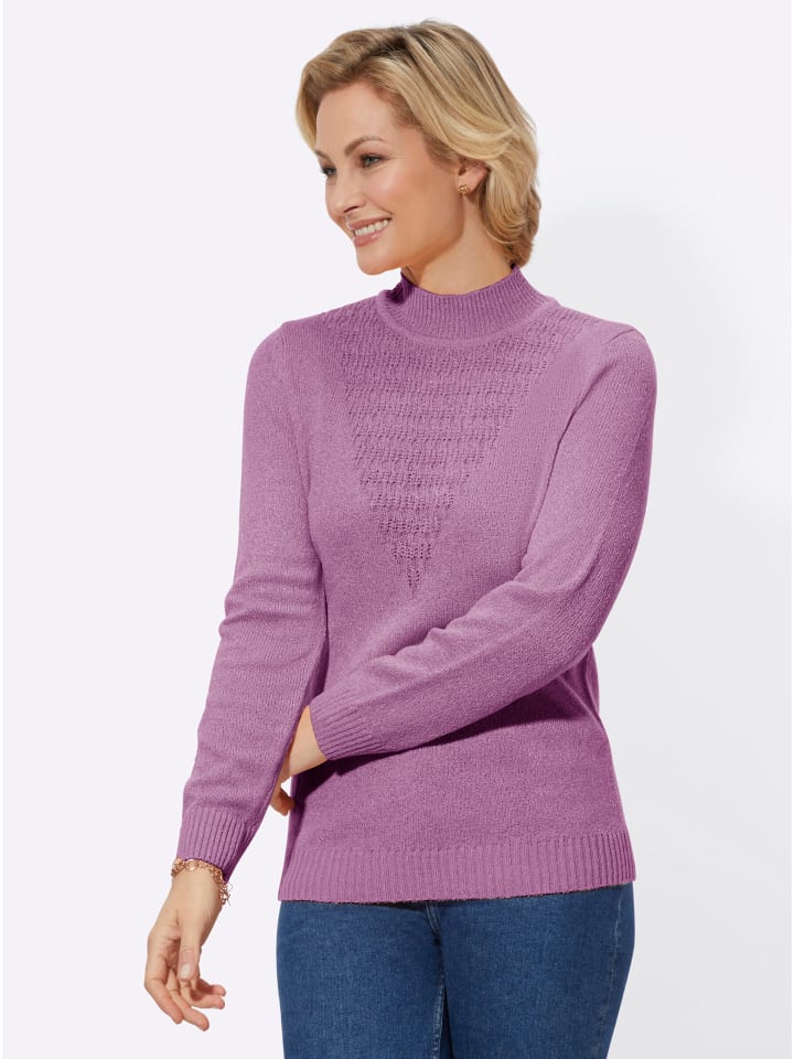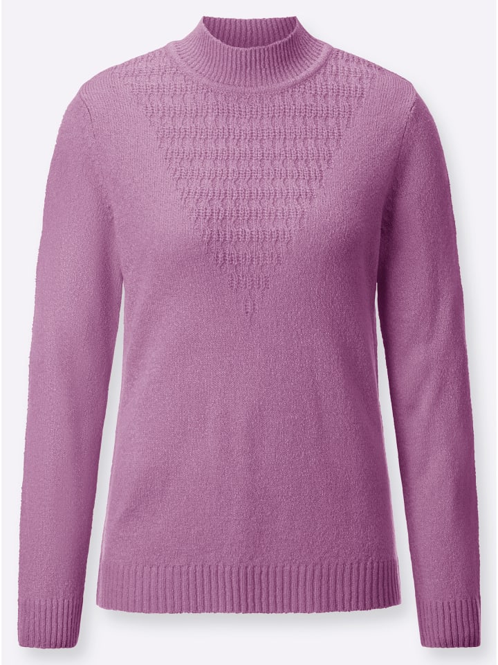 Удивительно мягкий, удобный и невероятно простой в уходе: свитер с воротником-стойкой и визуально удлиняющимся узором из ткани букле, не требующей особого ухода, спереди и сзади. Сложная вязка, придающая форму. Ребристые манжеты по подолу и на длинных рукавах.