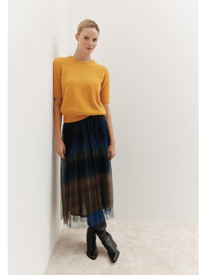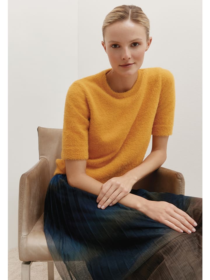 Этот пушистый свитер с короткими рукавами от MORE & MORE выглядит суперсовременно с юбкой из сетки макси, но его также можно носить повседневно с джинсами или клетчатыми брюками.