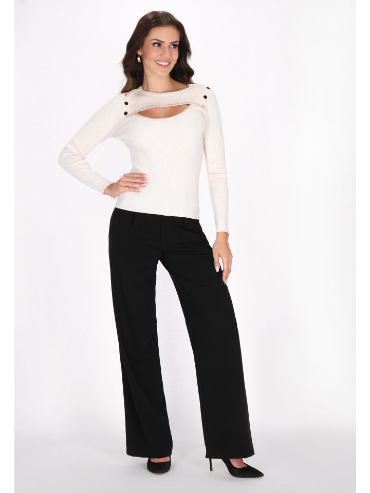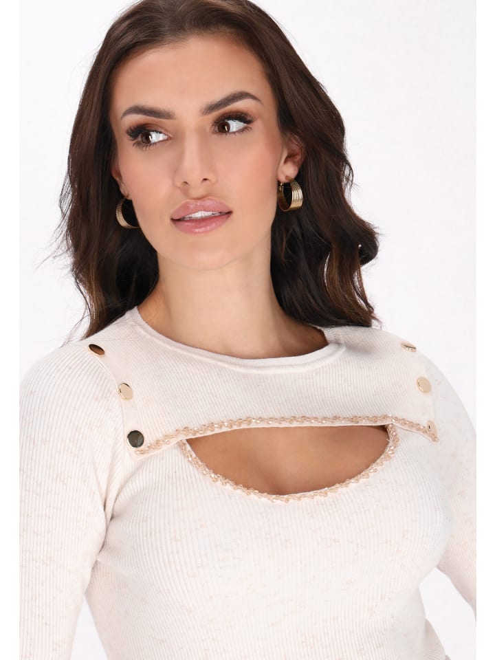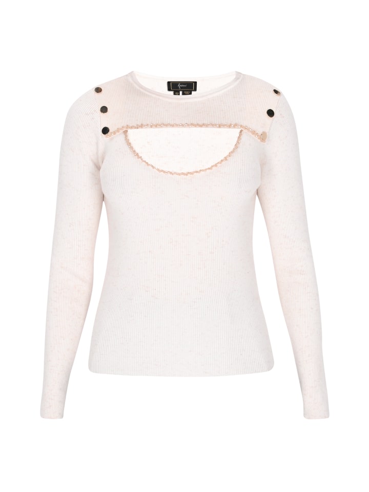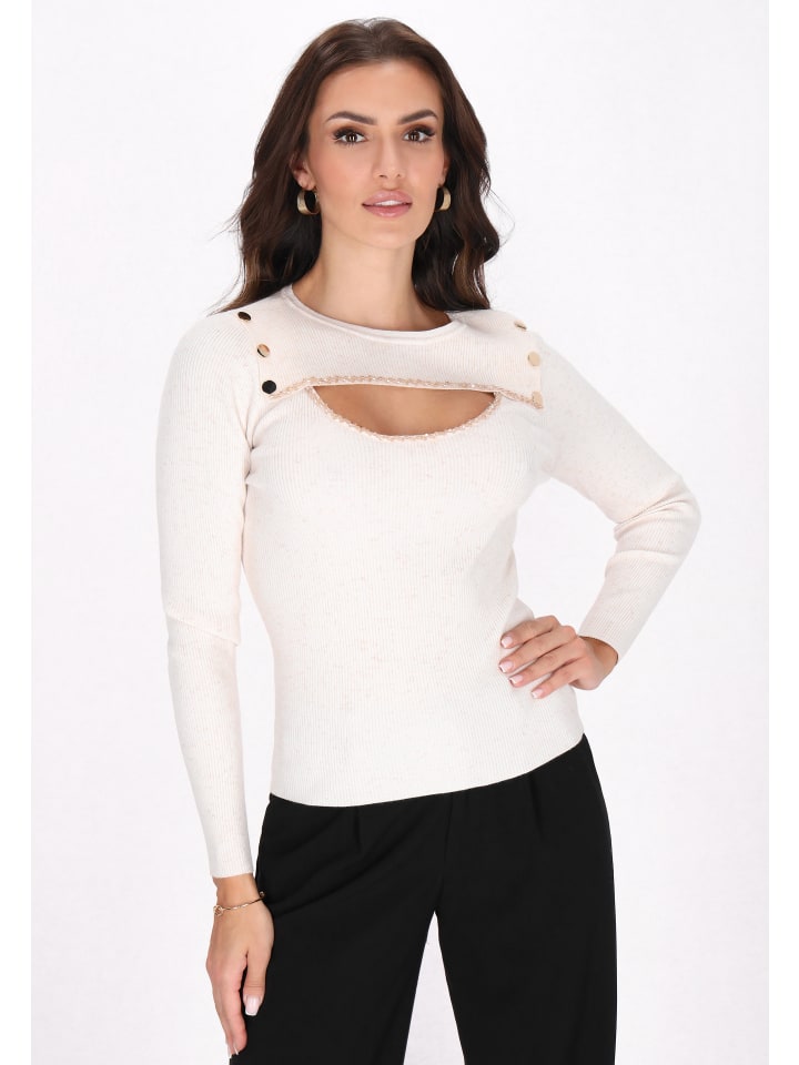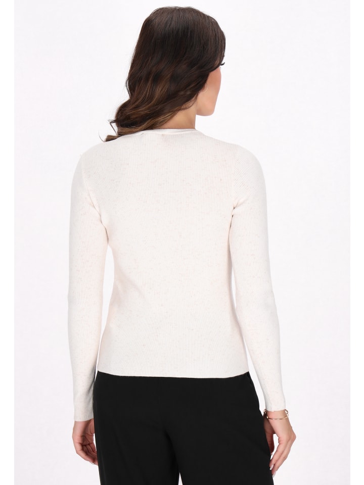 Представляем свитер из коллекции Fashion Look. Повседневный свитер с рукавами. Длинные рукава, классический крой и круглый вырез горловины с изящным вырезом, украшенным декоративной цепочкой. Приталенный силуэт сужается к талии. Мягкая и эластичная ткань обеспечивает комфорт и гибкость, идеально подходит для ношения в сочетании с другими вещами или отдельно.