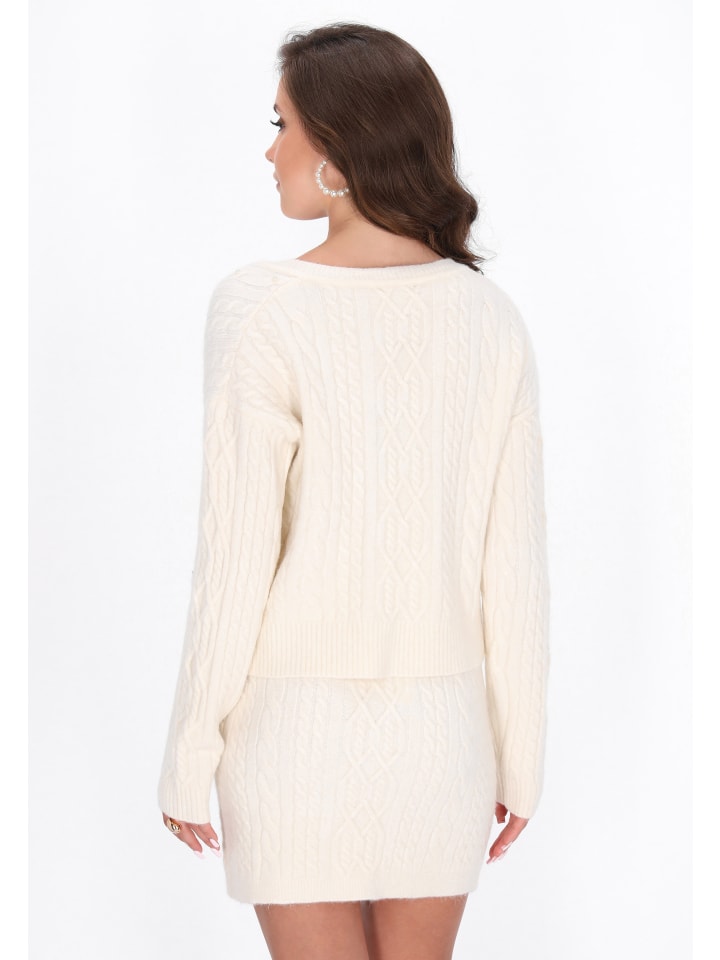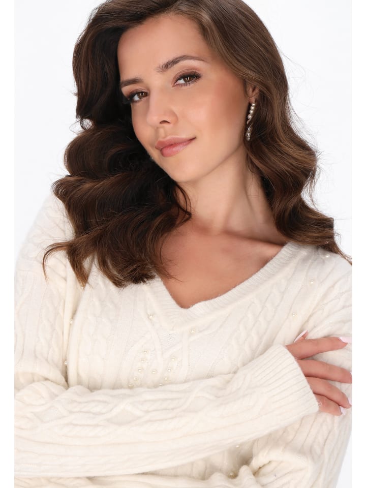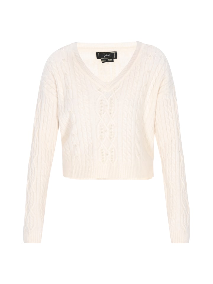 Этот модный короткий свитер - идеальный выбор для ценителей стильного комфорта. Изготовленный из мягкого трикотажа с клетчатым переплетением, он сочетает в себе классический дизайн и современные элементы. V-образный вырез слегка подчеркивает шею, а жемчужные украшения и мерцающая металлическая нить добавляют элегантности. Стандартный крой и длинные рукава обеспечивают комфортную носку, делая свитер идеальным выбором как для повседневных, так и для более женственных образов. Идеальный предмет для коллекции Fashion Look - на каждый день и для особых случаев.