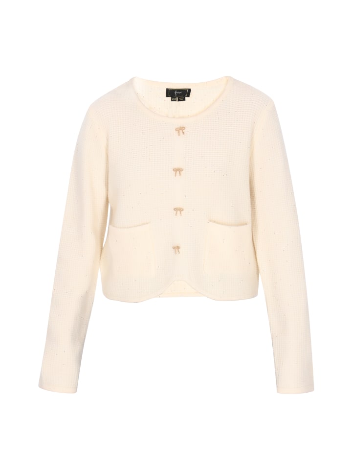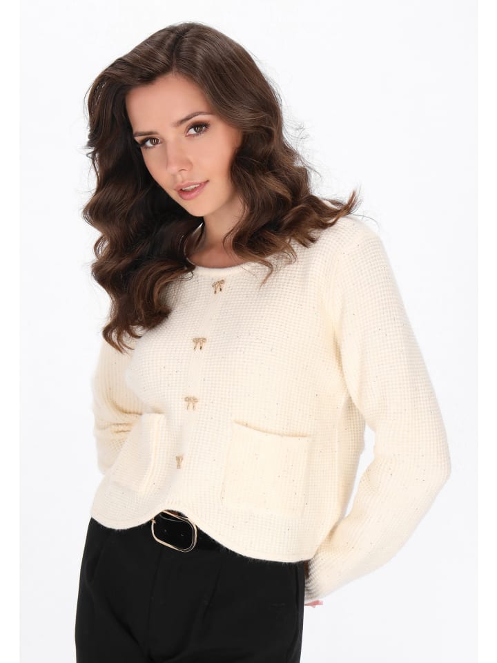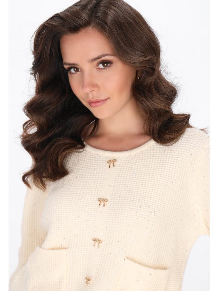 Этот кардиган стандартного кроя сочетает в себе комфорт и утонченный романтический стиль. Он связан из мягкой вафельной вязки с тонким металлическим волокном, которое придает ему сдержанный блеск. У него классический круглый вырез горловины и длинные рукава, а практичные карманы и декоративная застежка на пуговицы добавляют функциональности. Гладкий, однотонный узор делает кардиган идеальным для повседневного, модного образа. Идеально подходит для ценителей комфорта и элегантности. Этот кардиган входит в коллекцию Fashion Look.