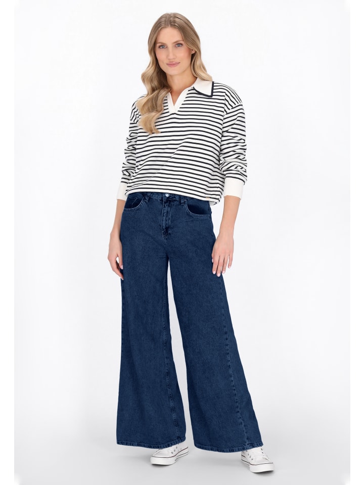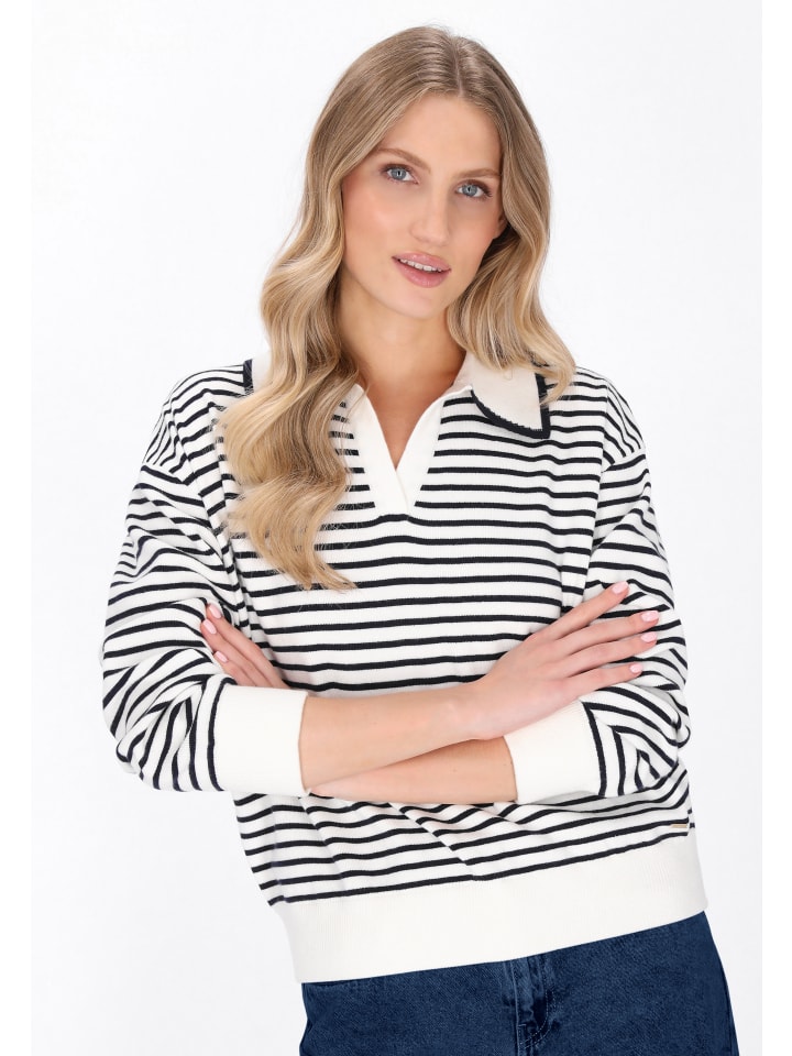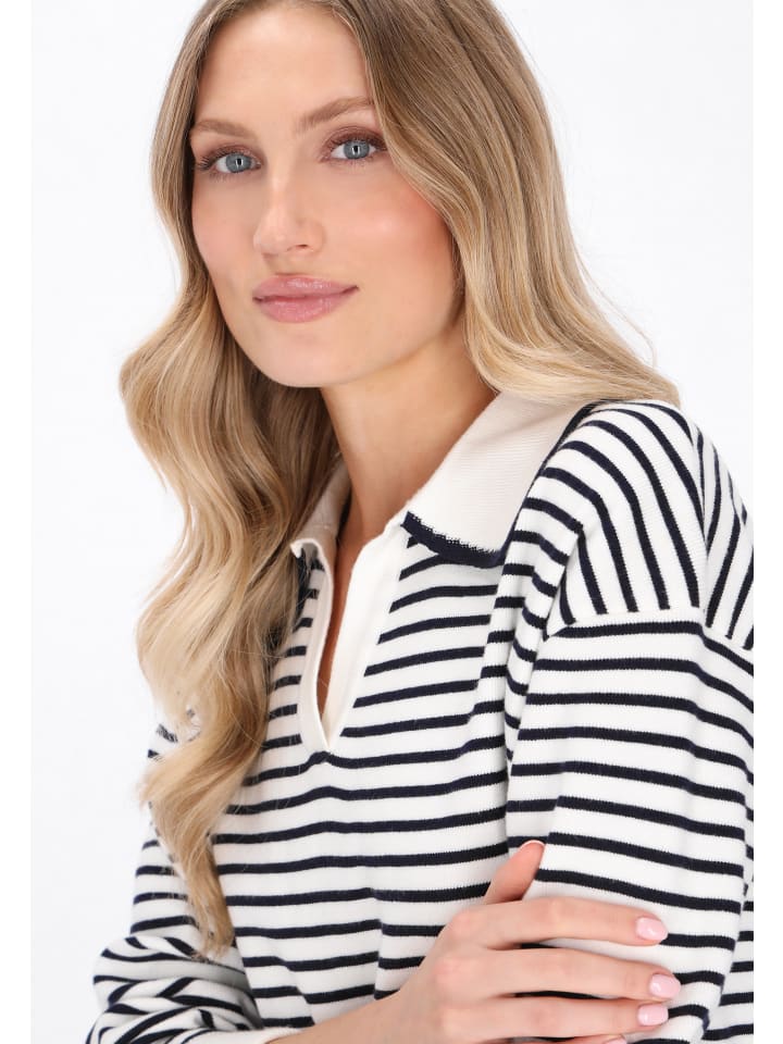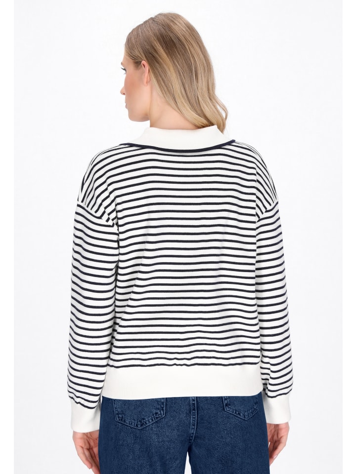 Стильный и удобный свитер из коллекции Maritime - идеальный выбор для ценителей повседневной и вневременной моды. Свободный крой с характерным воротником-поло и длинными рукавами гарантирует максимальный комфорт и свободу движений. Спущенная линия плеча придает свитеру модный, повседневный вид, а трикотажная структура и классический полосатый рисунок подчеркивают его морской характер. Идеально подходит для повседневной носки. Этот свитер - квинтэссенция повседневной моды с ноткой морской непринужденности.