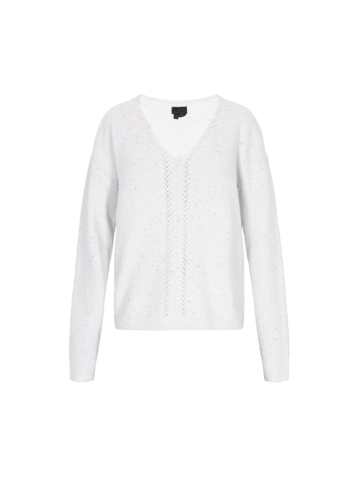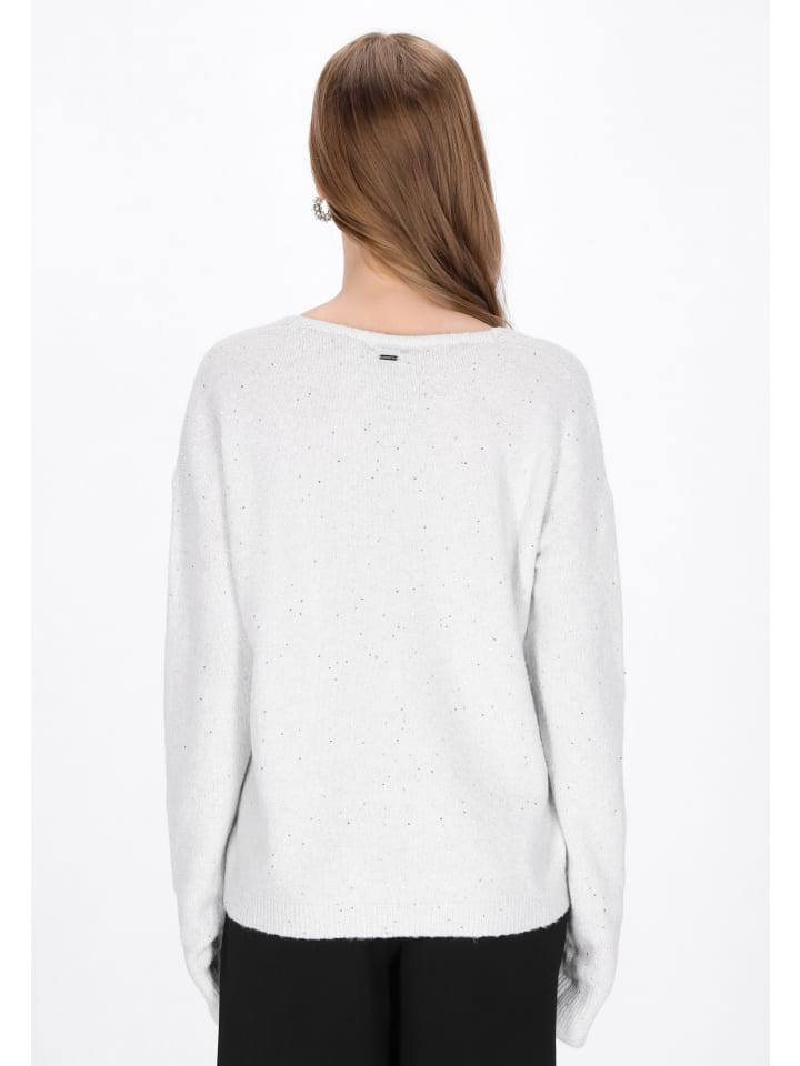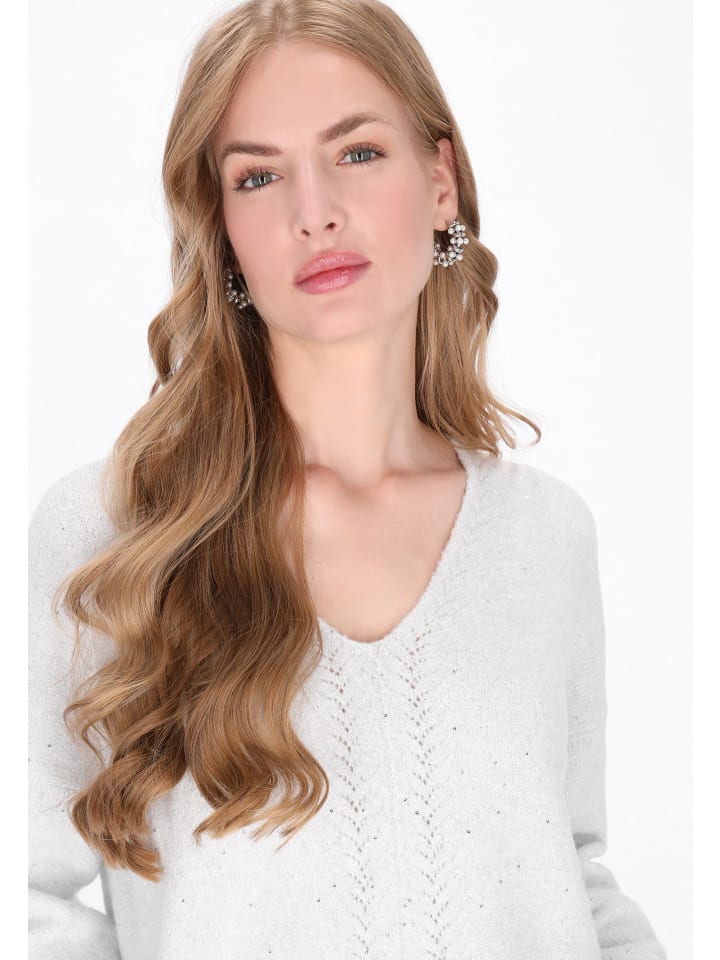 Этот трикотажный свитер свободного кроя с глубоким V-образным вырезом и длинными рукавами, спущенными плечами для дополнительного комфорта. Узор «ажур», украшенный пайетками и блестящей нитью, подчеркивает его вневременное очарование. Эта модель из классической коллекции, одновременно непринужденная и в то же время стильная, идеально подходит для создания многослойного образа или самостоятельного ношения в прохладные дни.