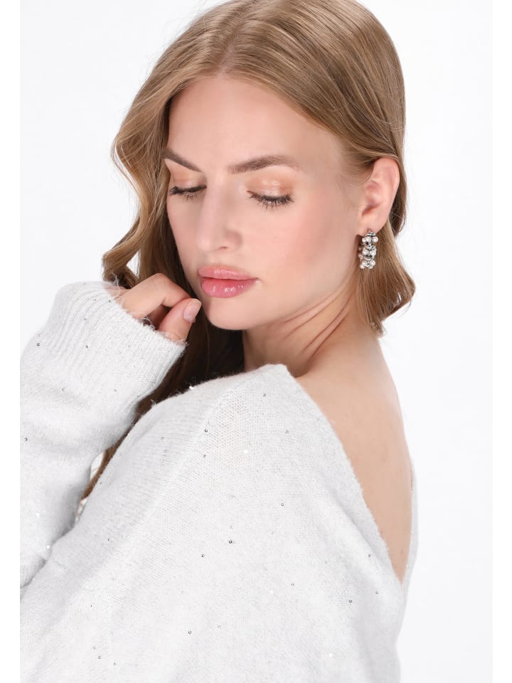 Стильный свитер свободного кроя с острым вырезом, длинными рукавами и спущенной линией плеча. Трикотажная конструкция украшена пайетками и блестящей нитью, что придает элегантность простой модели. Удобный и повседневный свитер из классической коллекции, идеально подходящий для создания стильных образов, которые будут выделяться в любой обстановке.