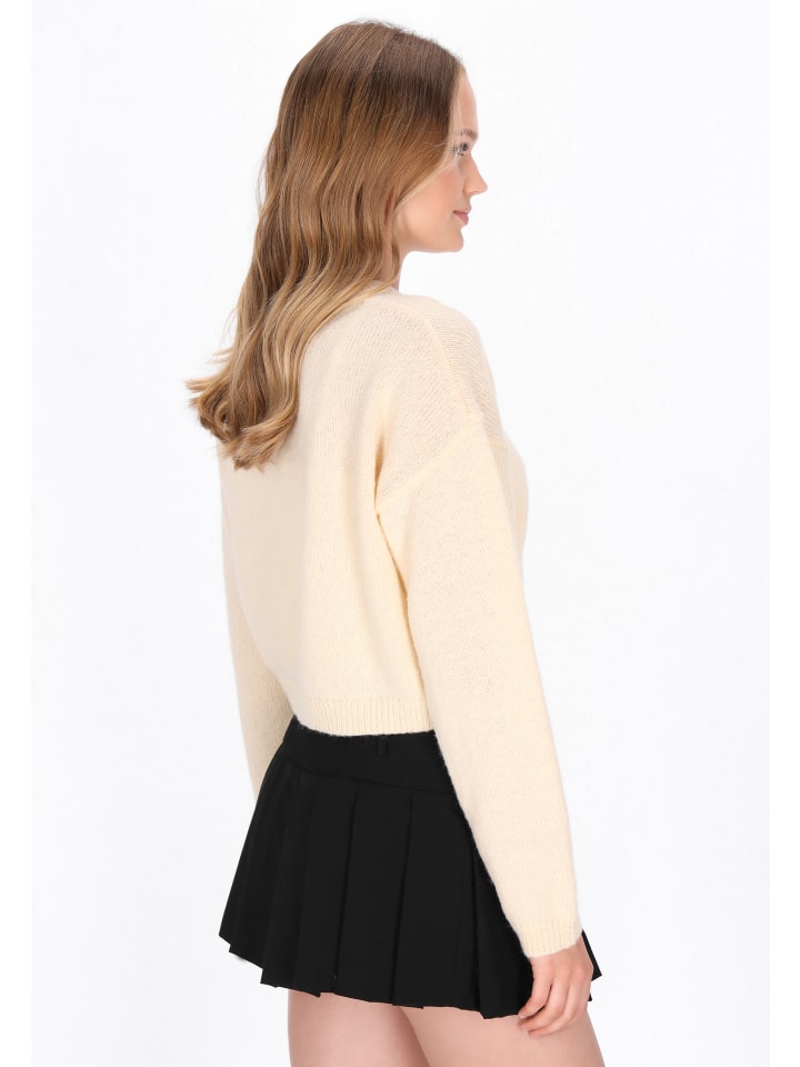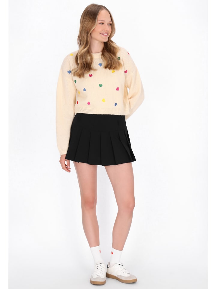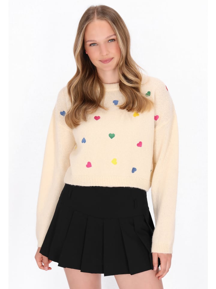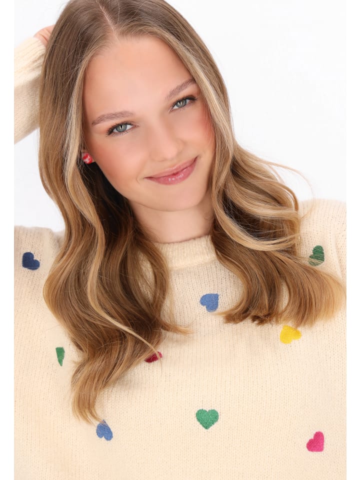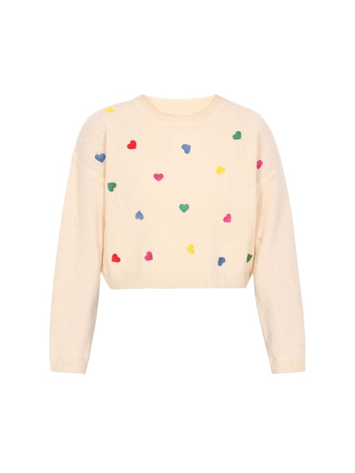 Свободный свитер, сочетающий комфорт и очаровательный молодежный стиль. Изготовленный из мягкой трикотажной ткани и украшенный вышитым узором в виде сердца, он привлекает внимание своим нежным, женственным шармом. Круглый вырез горловины, длинные рукава и спущенная линия плеча создают непринужденный образ, идеально подходящий для повседневных образов. Теплый, приятный на ощупь и исключительно удобный - идеальный выбор для прохладных дней с модной изюминкой.