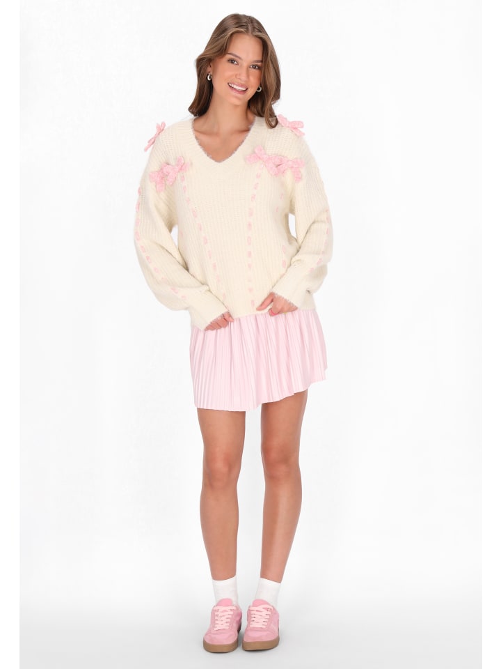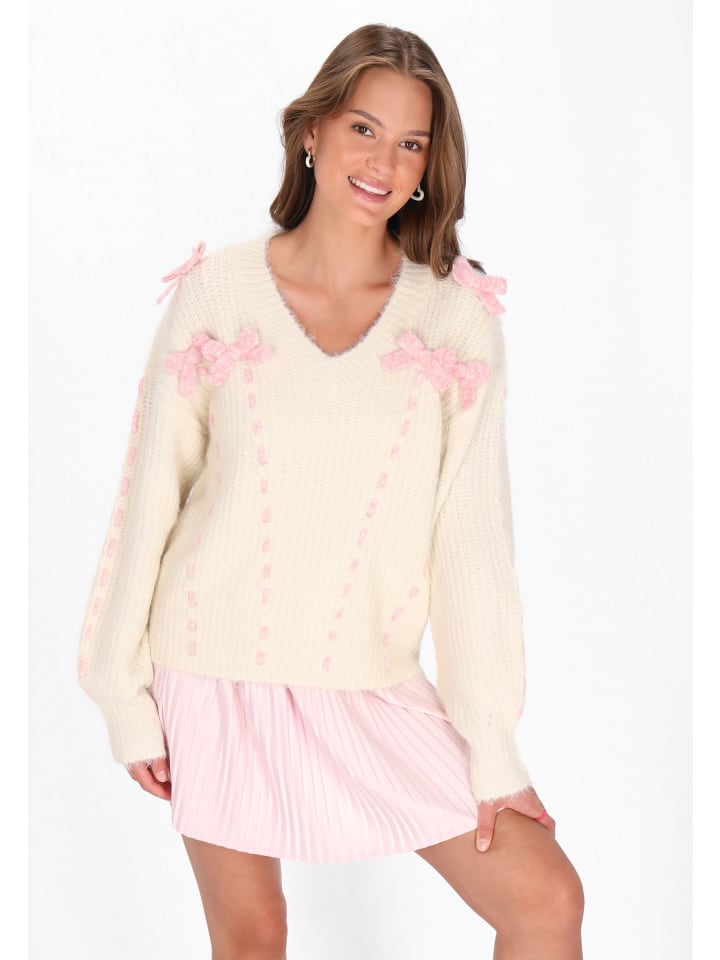 Стильный и очаровательный свитер свободного кроя, идеально подходящий для тех, кто ценит комфорт и молодежный образ. V-образный вырез, длинные рукава-бишоп и спущенные плечи придают этому изделию непринужденный шик. Изготовленный из мягкой трикотажной ткани, он украшен тонким вышитым бантом, придающим ему женственность. Это повседневный, уютный и комфортный вариант, идеально подходящий как для повседневной носки, так и для особых случаев. Этот свитер входит в коллекцию Young Fashion.