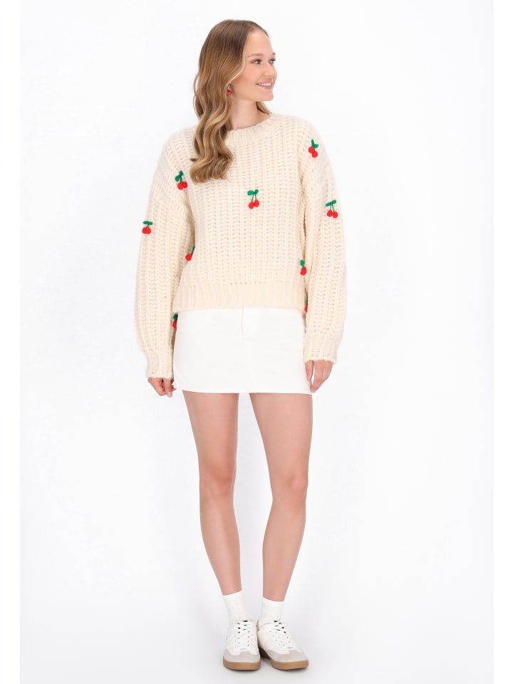 Этот свободный свитер сочетает в себе комфорт и очаровательный девичий стиль. Изготовленный из мягкого трикотажа и украшенный вышитым рисунком вишни, он привлекает внимание своим жизнерадостным акцентом. Круглый вырез горловины, длинные рукава-фонарики и спущенные плечи создают непринужденный и непринужденный образ. Теплый, удобный и мягкий на ощупь - идеально подходит для повседневной носки для любителей милого молодежного стиля. Входит в коллекцию Young Fashion.