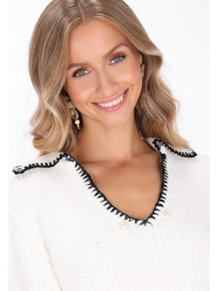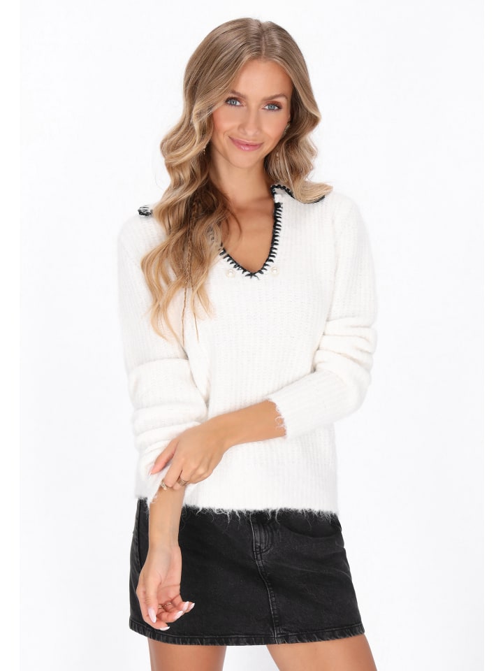 Свитер прямого кроя с V-образным вырезом и классическим воротником. Изготовлен из мягкой трикотажной ткани с гладким рисунком, он дополнен контрастной окантовкой и тонкими жемчужными акцентами, которые придают ему нотку шика. Длинные рукава обеспечивают комфорт, а непринужденный стиль делает его идеальным дополнением к повседневным нарядам. Уютный, комфортный и модный - этот кардиган из коллекции Fashion Look.
