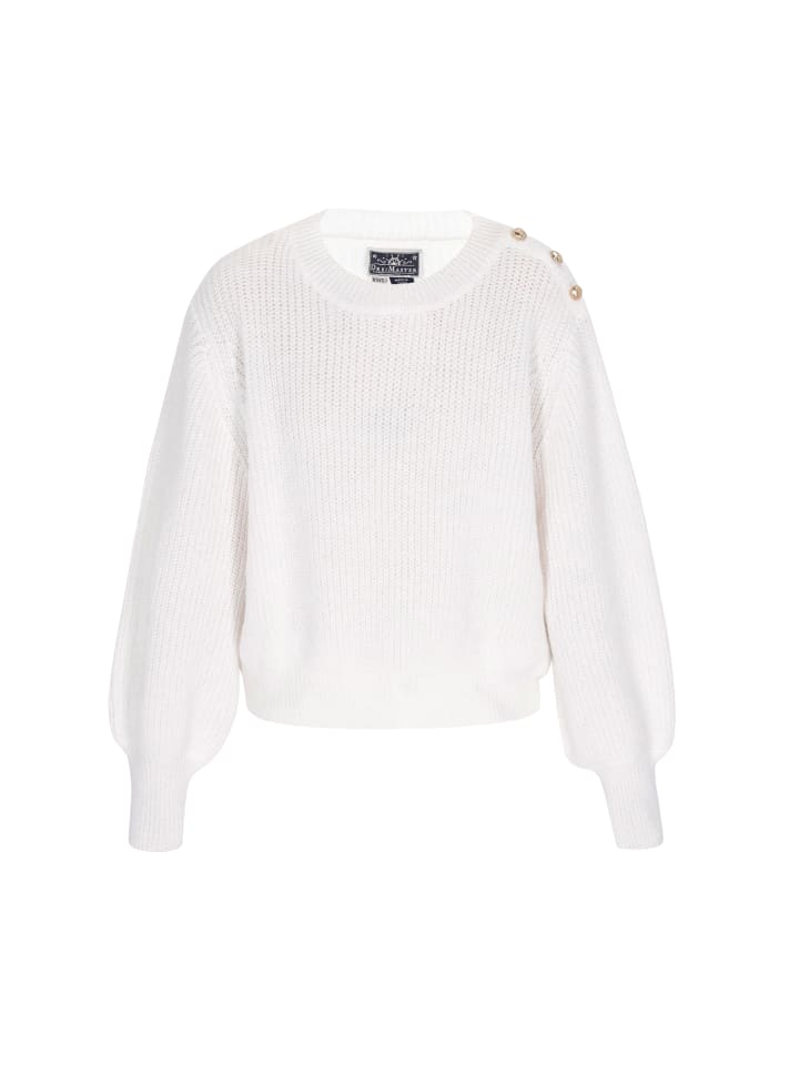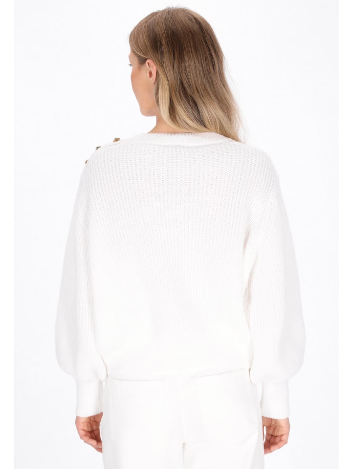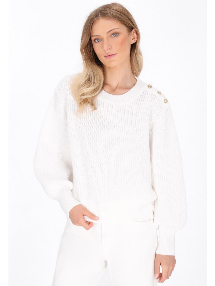 Свободный свитер с круглым вырезом, связанный из мягкой пряжи. Исключительно удобные длинные рукава придают ему элегантность и легкость, а декоративные пуговицы добавляют изящный и оригинальный штрих. Гладкий, однотонный узор подчеркивает вневременной, непринужденный стиль. Этот комфортный и уютный свитер - идеальный повседневный выбор, сочетающий комфорт и классическую эстетику. Этот свитер входит в коллекцию «Морская коллекция».