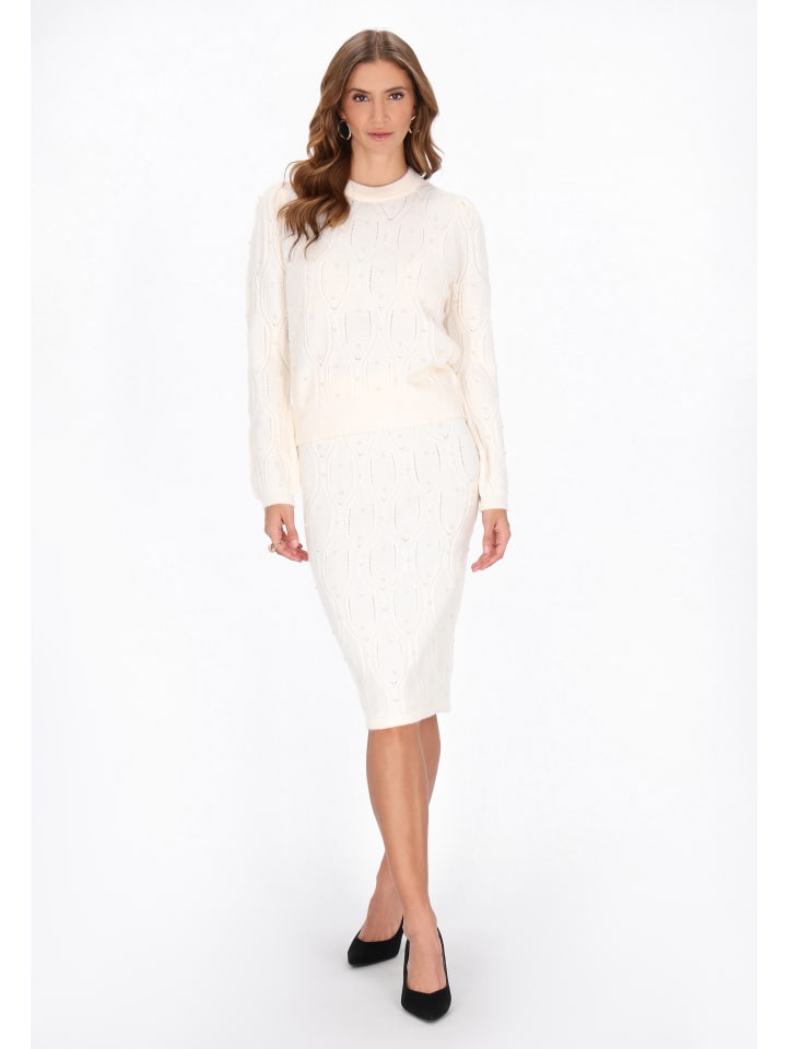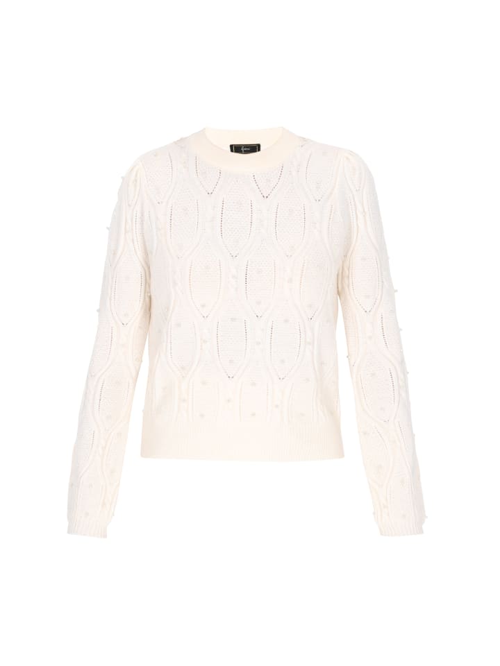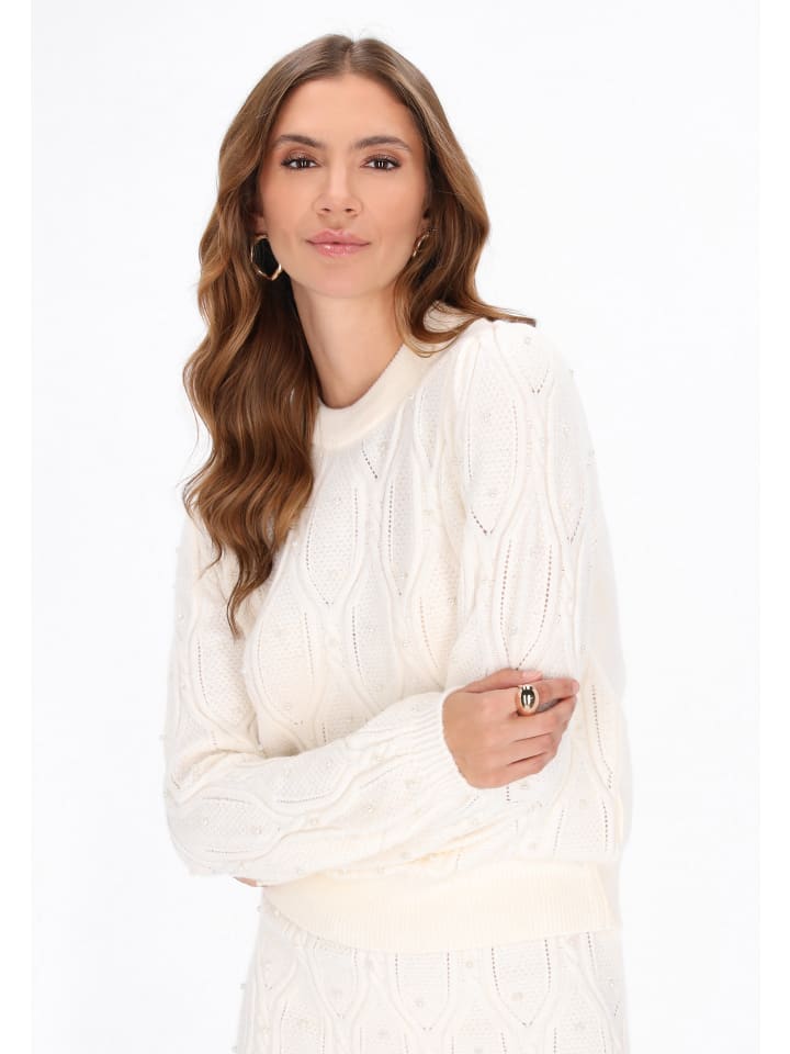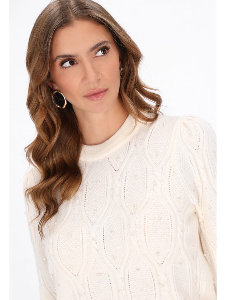 Этот свитер прямого кроя с классическим круглым вырезом горловины сочетает в себе комфорт и утонченную элегантность. Изготовленный из мягкого трикотажа с ажурным узором, он украшен изящными бусинами для придания ему женственности. Длинные, слегка присборенные рукава придают ему модный вид, а мягкая ткань обеспечивает комфорт и тепло. Идеально подходит для повседневных образов, где комфорт и стиль играют ключевую роль. Этот свитер входит в коллекцию Fashion Look.