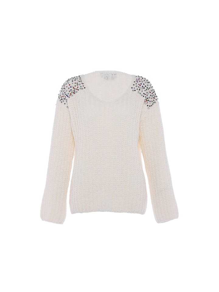 Подчеркните свой стиль с этим элегантным свитером из нашей коллекции Fashion Look. Он отличается удобным стандартным кроем, длинными рукавами-фонариками и элегантным V-образным вырезом. Вязаный свитер украшен ажурным узором и сверкающими пайетками, что добавляет ему изюминку. Идеально скроенный, этот стильный свитер идеально подходит для многослойной одежды, создавая развевающийся силуэт. Входит в коллекцию Fashion Look.