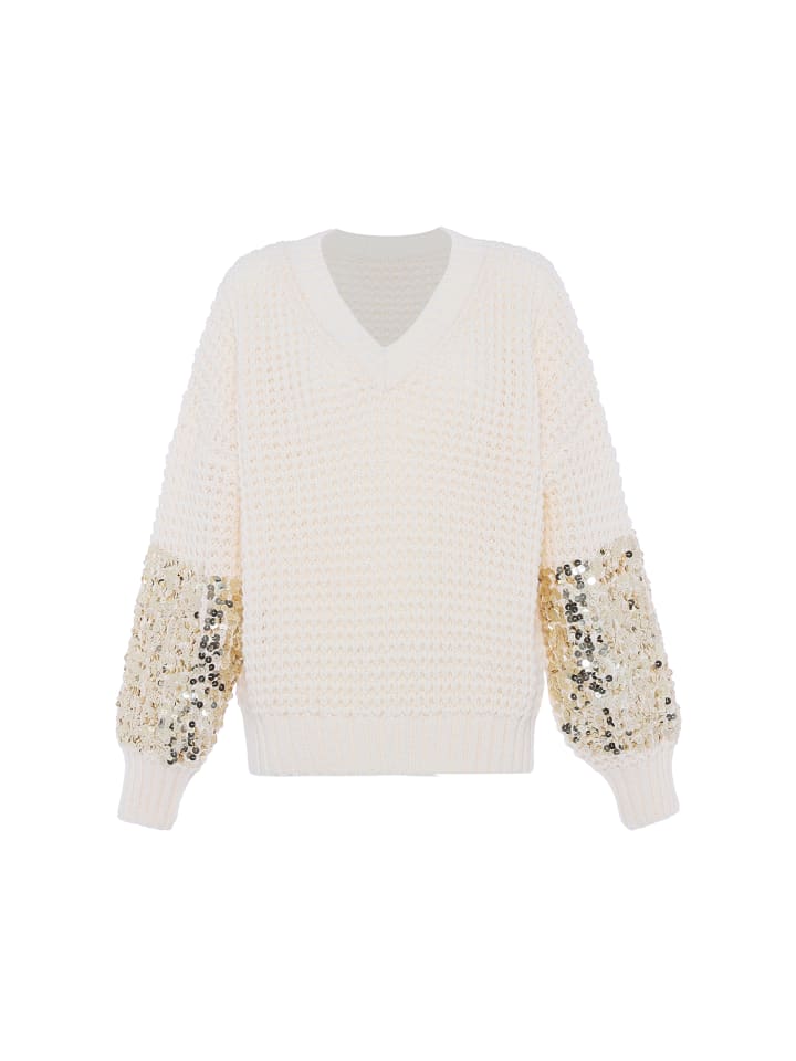 Подчеркните свой стиль с этим элегантным трикотажным свитером прямого кроя с V-образным вырезом. Длинные рукава-фонарики, украшенные пайетками, добавляют нотку шика. Этот стильный свитер из коллекции Fashion Look с ребристым краем для дополнительного комфорта идеально подходит для создания модного и эффектного образа.
