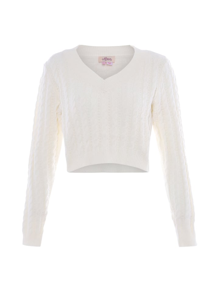 Откройте для себя вязаный свитер с замысловатым фактурным узором, напоминающим плетение косичек. Этот свитер с V-образным вырезом, длинными рукавами и ребристым подолом, манжетами и вырезом горловины обеспечивает комфортную посадку. Укороченная длина выше талии делает этот уютный и стильный свитер идеальным вариантом для прохладной погоды. Разработанный совместно с aleva, этот свитер сочетает в себе классический стиль и современный дизайн.