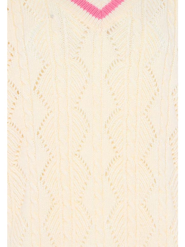 Откройте для себя стильный вязаный свитер с классическим V-образным вырезом. Текстурированный узор с замысловатыми косами на корпусе и рукавах. Контрастные полосы на вырезе, манжетах и подоле подчеркивают его индивидуальность. Длинные рукава и ребристые манжеты обеспечивают удобную и уютную посадку. Разработанный совместно с Blonda, этот свитер сочетает в себе классический стиль и современный дизайн.