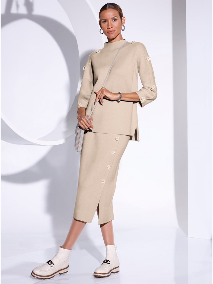 Этот свитер из смесовой шерсти из мягкой пряжи впечатляет своим современным свободным кроем и декоративными пуговицами вдоль рукавов «летучая мышь» длиной 3/4 с отворотами. Низ изделия удлинен сзади и имеет боковые разрезы.