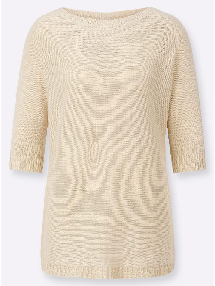Этот приятный к телу свитер горизонтальной вязки особенно очарователен сзади благодаря планке с пуговицами на горловине, которая слегка приоткрывает кожу. Он отличается модным дизайном с широким круглым вырезом в рубчик и рукавами «летучая мышь» длиной 3/4 с манжетами в рубчик. Спереди закругленный подол, спинка прямая. Сертифицировано GOTS.