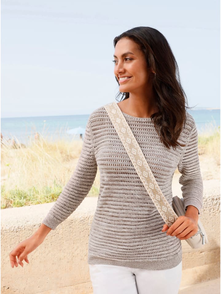 Эффектная меланжевая пряжа и красивый узор вязки делают этот ажурный свитер неотразимым! Вырез горловины «лодочка» и резинка на рукавах 3/4 и подоле. Сертифицировано OCS.