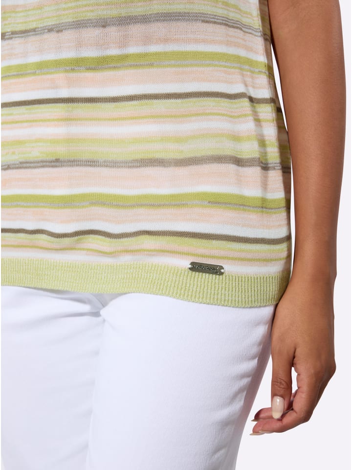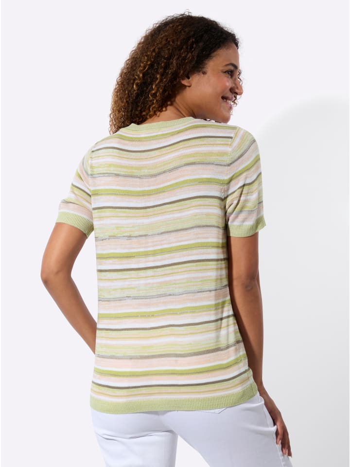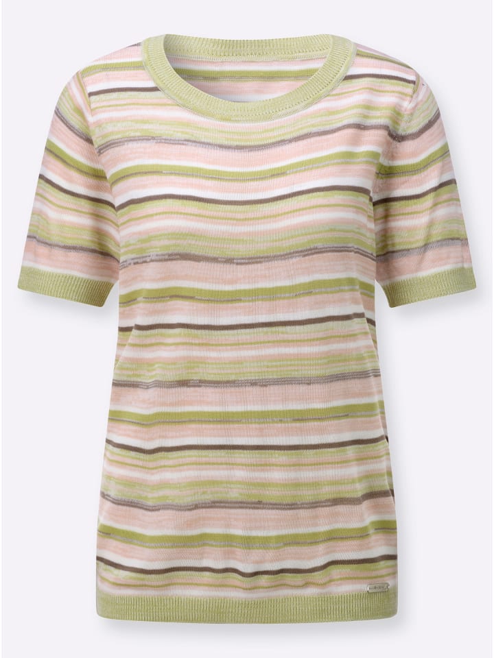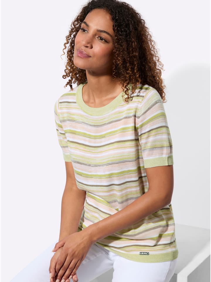 Мягкий и простой в уходе - вот что такое этот полосатый свитер с меланжевым эффектом. Круглый вырез горловины, манжеты и низ в рубчик. Вязаный, идеально садится по фигуре.