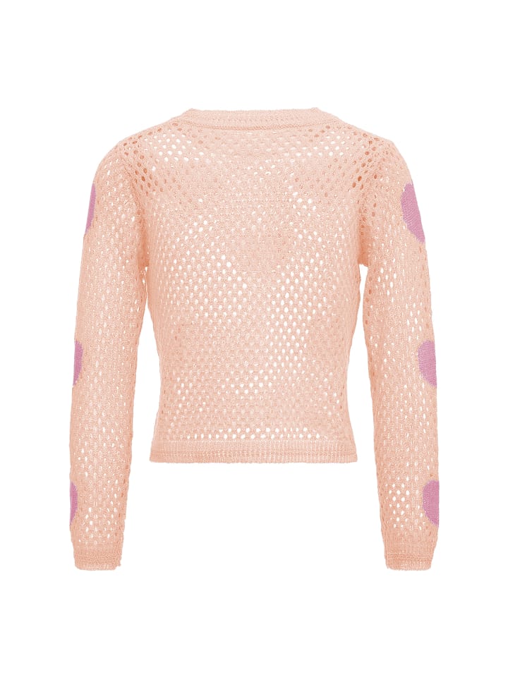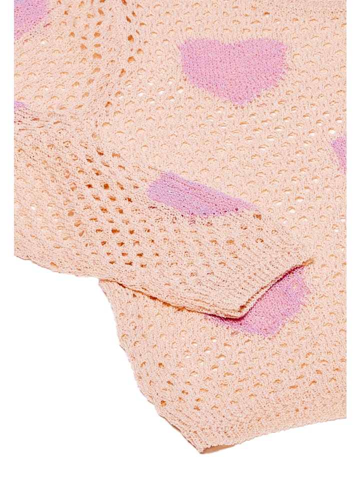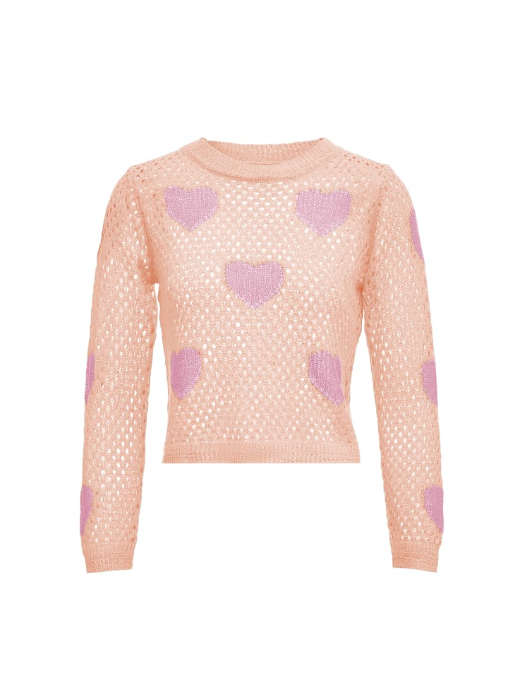 Украсьте свой гардероб этим очаровательным свитером с текстурированным узором вязки. Этот топ с круглым вырезом, украшенный сердечками на груди и рукавах, обеспечивает плотное прилегание благодаря ребристому вырезу, манжетам и подолу. Игривый, но свободный фасон идеально подходит для модных образов. Полупрозрачная ткань добавит очарования вашему образу. Разработанная совместно с IMMY, эта модель сочетает в себе классический стиль и современный дизайн.