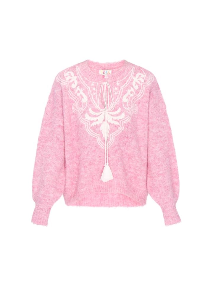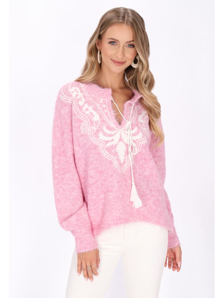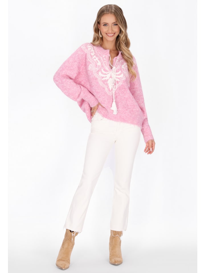 Оставайтесь стильными и непринужденными в этом свободном свитере из коллекции Boho. Вырез-замочная скважина, длинные рукава со спущенным плечом и изысканная отделка кисточками сочетают в себе непринужденный комфорт и богемный шарм. Этот уютный свитер, связанный с вышитым орнаментом, добавит изящный декоративный штрих в ваш повседневный гардероб. Идеально подходит для многослойной одежды или самостоятельного ношения, это универсальная вещь, сочетающая комфорт и вневременной стиль.