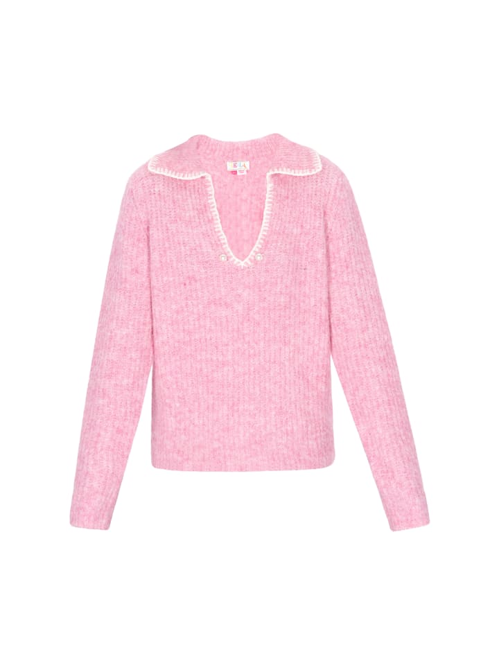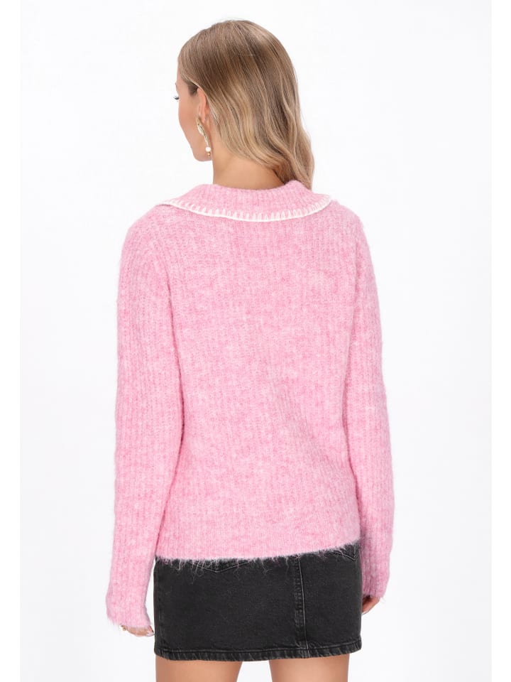 Свитер прямого кроя с V-образным вырезом и классическим воротником. Изготовлен из мягкой трикотажной ткани с гладким рисунком, он дополнен контрастной окантовкой и тонкими жемчужными акцентами, которые придают ему нотку шика. Длинные рукава обеспечивают комфорт, а непринужденный стиль делает его идеальным дополнением к повседневным нарядам. Уютный, комфортный и модный - этот кардиган из коллекции Fashion Look.