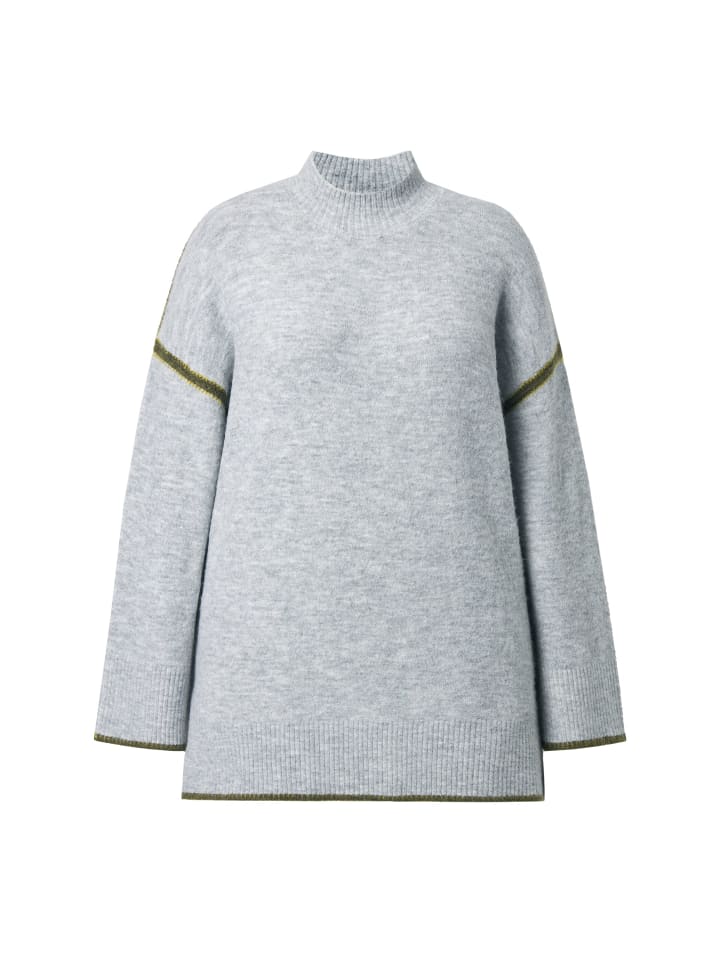 Свитер удобной посадки из мягкого тонкого трикотажа с декоративными швами на спущенных плечах и подоле. Воротник-стойка, широкие длинные рукава, широкие манжеты на резинке. Боковые разрезы для дополнительного комфорта.
