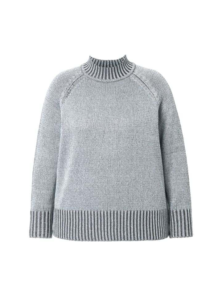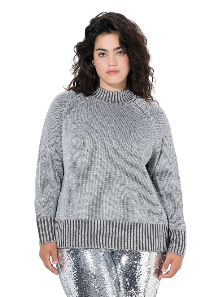 Свитер прямого кроя из мягкой тонкой пряжи с блестящим эффектом спереди. Небольшой воротник-стойка, манжеты на резинке, длинные рукава реглан.