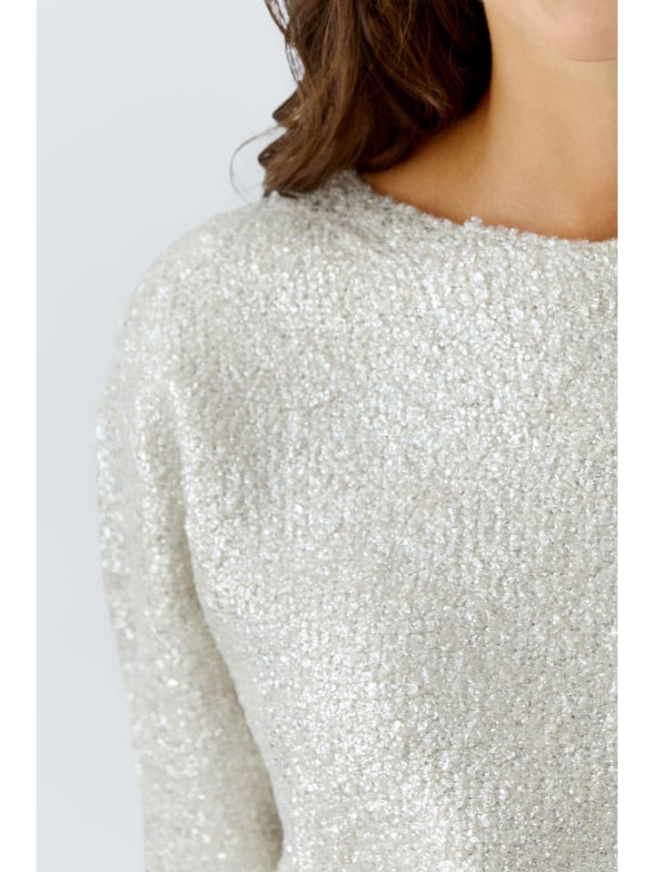 Особенности: бесшовный свитер, связанный с изнанки и украшенный серебристым мерцанием