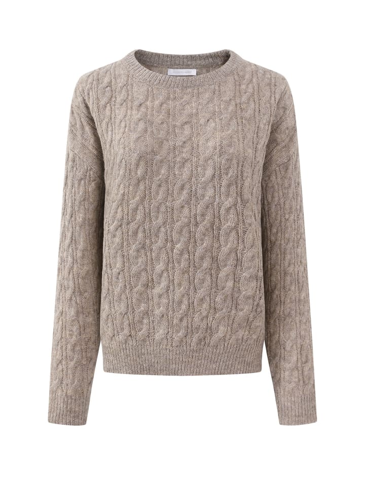 Этот свитер с косичной вязкой сочетает в себе комфорт и модную изысканность. Классический дизайн вязки дополнен текстурированной, яркой поверхностью благодаря эффектному узору с косичной вязкой, что придает свитеру вневременной вид. Мягкая, крупная вязка обеспечивает приятное тепло и исключительный комфорт. Благодаря свободному крою и слегка спущенным плечам образ получается непринужденным и современным. Широкие ребристые манжеты на рукавах и подоле гармонично дополняют дизайн. Этот свитер можно носить как с джинсами, так и в сочетании с юбкой и сапогами, он станет универсальной и незаменимой вещью для женственных повседневных образов.