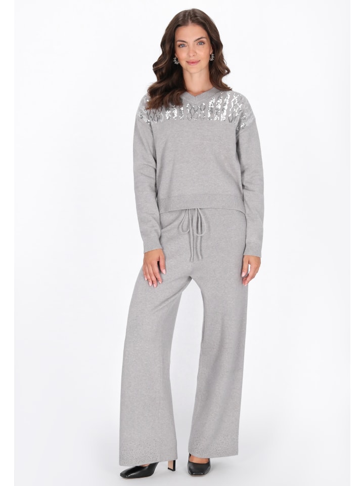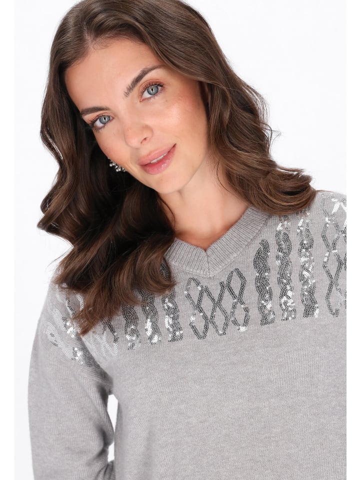 Этот свитер из коллекции Usha Black Label сочетает в себе комфорт и элегантность. Изготовленный из мягкого трикотажа и украшенный изящными пайетками, он очаровывает своим модным и уютным видом. Свободный крой со спущенной линией плеча и длинными рукавами обеспечивает комфортную носку, а V-образный вырез добавляет женственности. Идеальный выбор на каждый день - непринужденный, стильный и с ноткой шикарного мерцания.