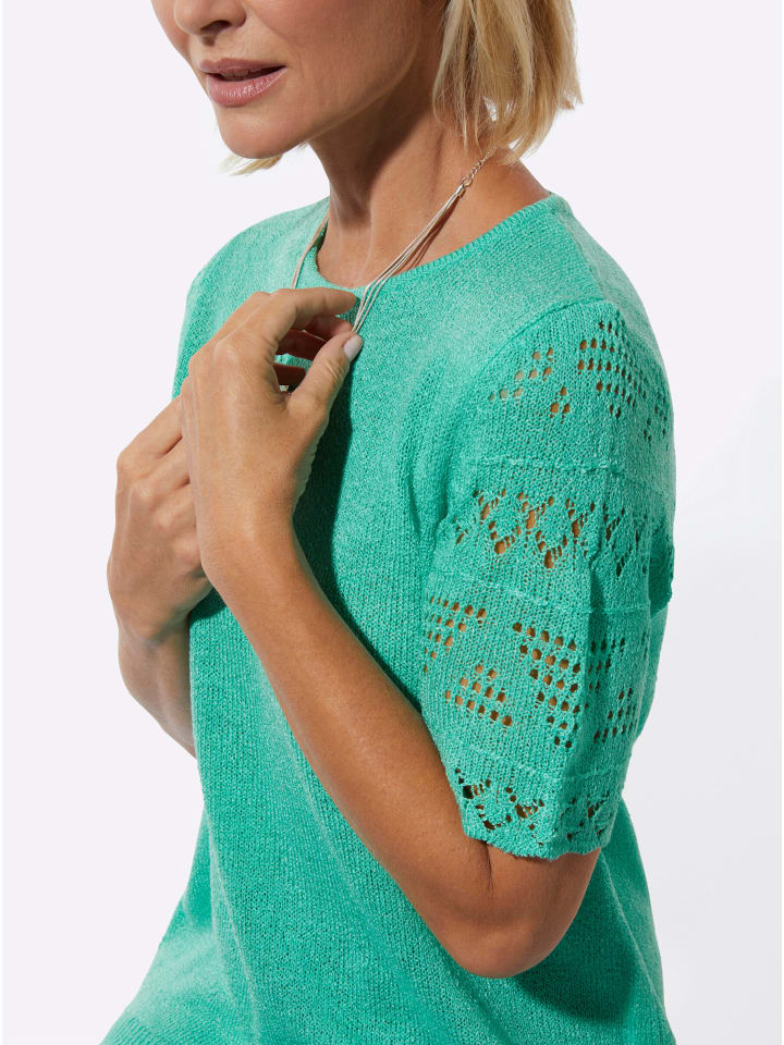 Мягкая пряжа очень приятна на ощупь! Свитер из букле трикотажной вязки. С ажурным узором на рукавах и слегка закругленными краями. Манжеты фигурные и ребристые.