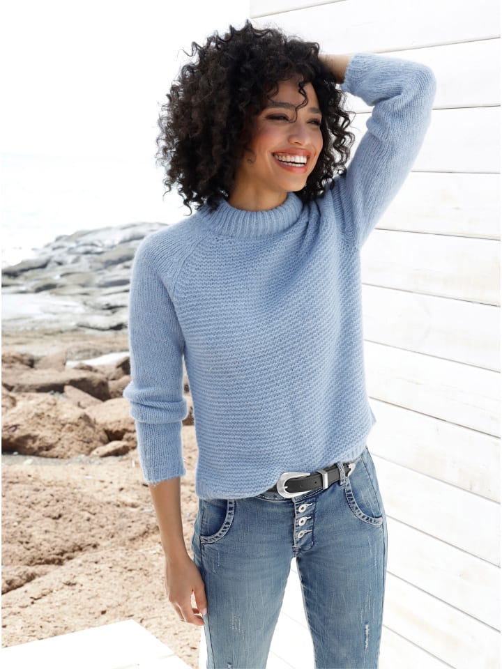 Свитер: мягкий и теплый, из привлекательной смеси пряжи, частично связанный лицевой гладью. С воротником-стойкой, длинными рукавами реглан и манжетами в рубчик.