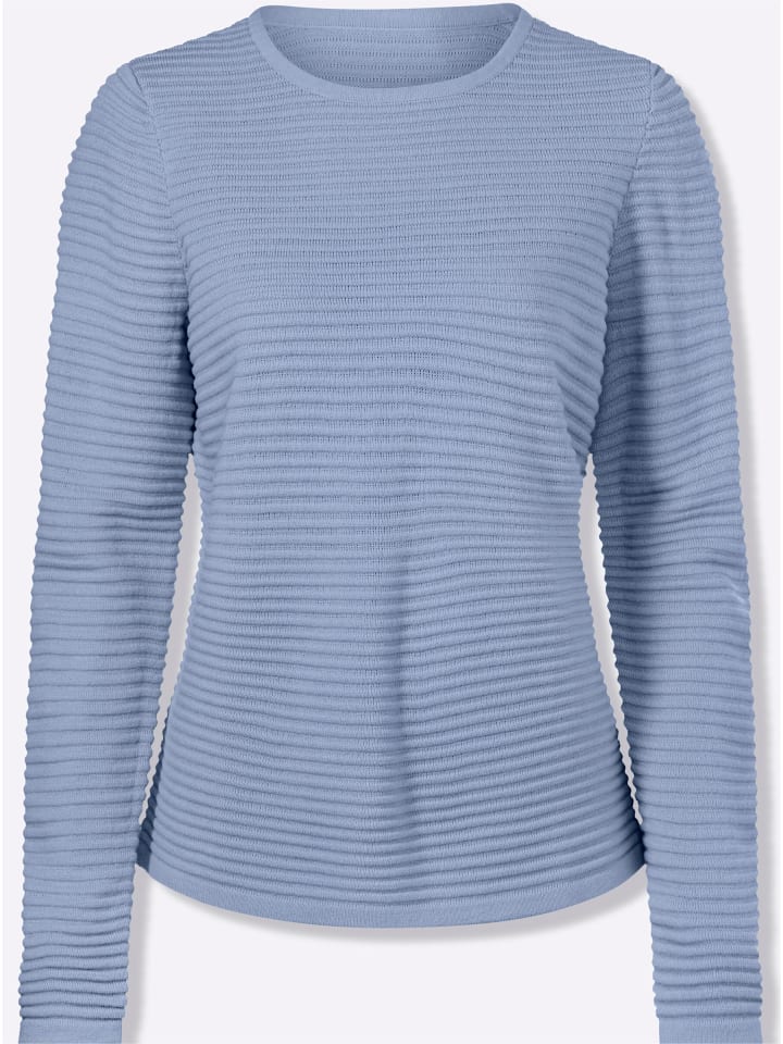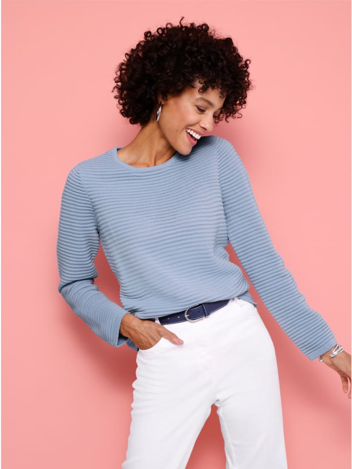 Удивительно простой и идеальный для повседневной носки: свитер с длинными рукавами, связанный горизонтальным ребристым узором. Круглый вырез горловины.