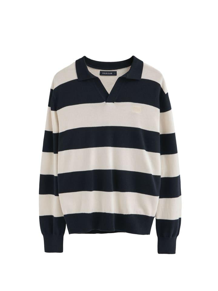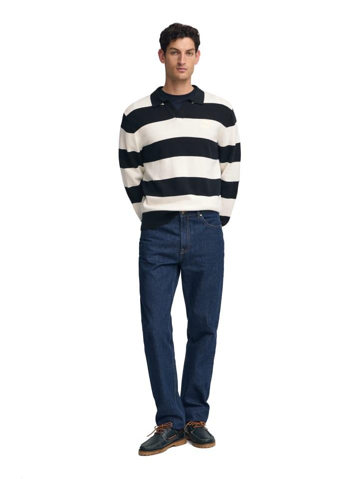 Мужской свитер прямого кроя с длинными рукавами, воротником-поло. Изготовлен из смеси шерсти и хлопка. Украшен полосатым узором и нашивками. Универсальный и стильный предмет одежды.