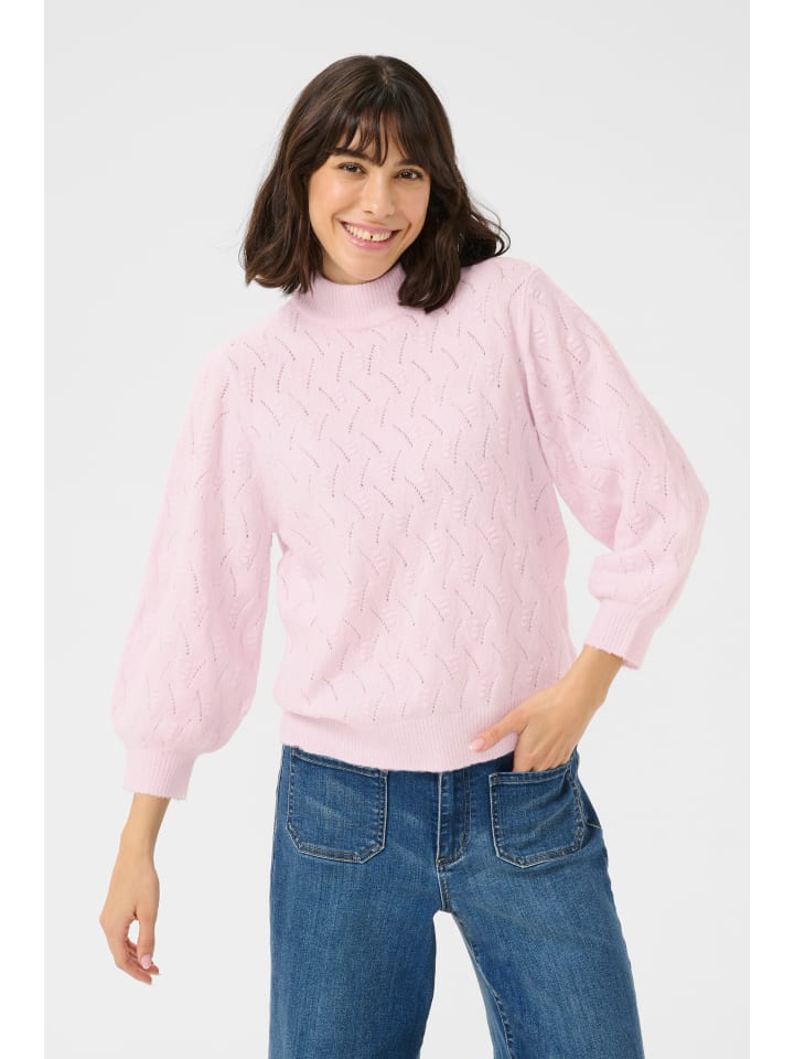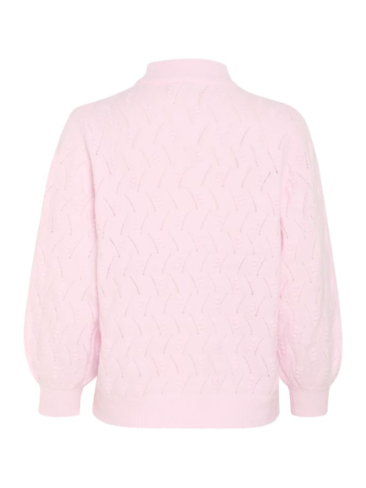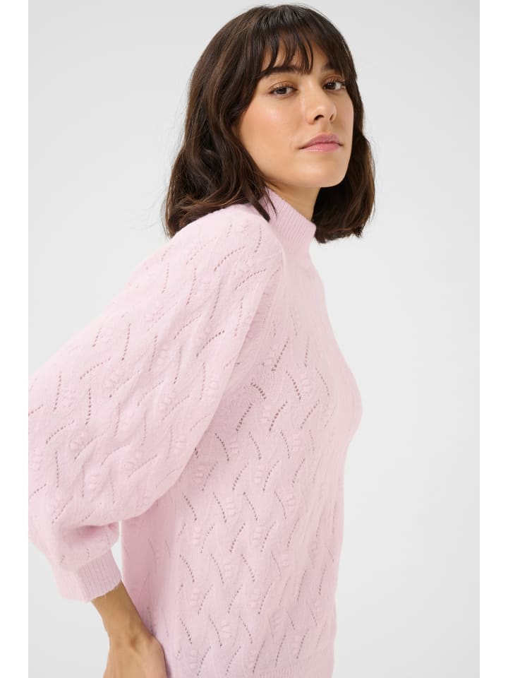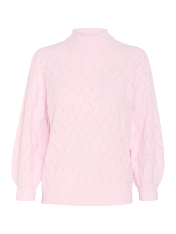Свитер с воротником-стойкой, тонкой фактурой вязки и ажурным узором. Прямой, свободный крой и слегка приподнятые рукава с ребристыми манжетами.