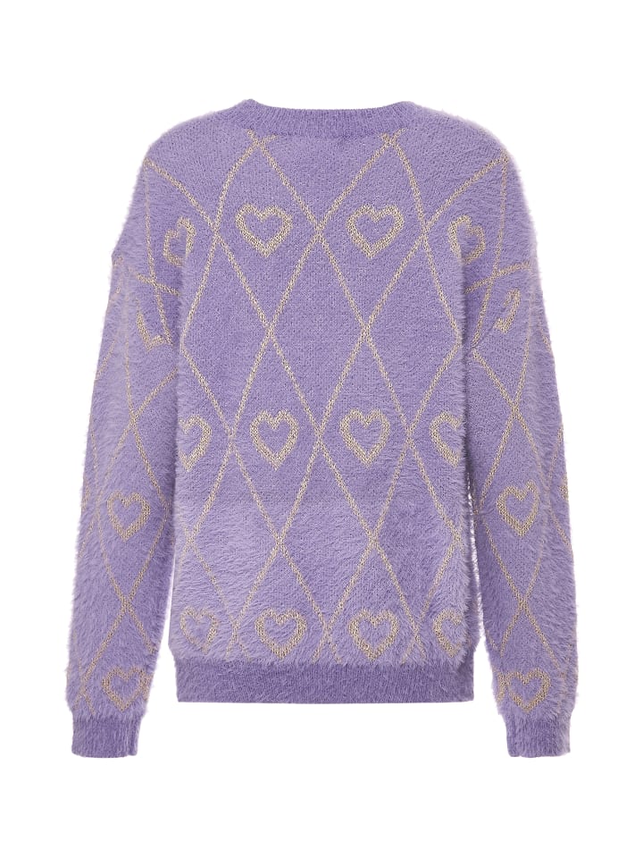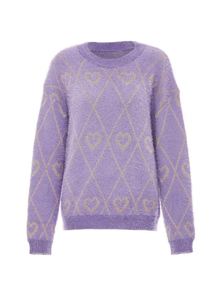 Этот свитер из пряжи с начесом, выполненной методом эбиза, имеет слегка пушистый вид и чувственный узор в виде сердечек, выполненный золотой нитью. Помимо классического силуэта, он отличается спущенными плечами и ребристыми манжетами.