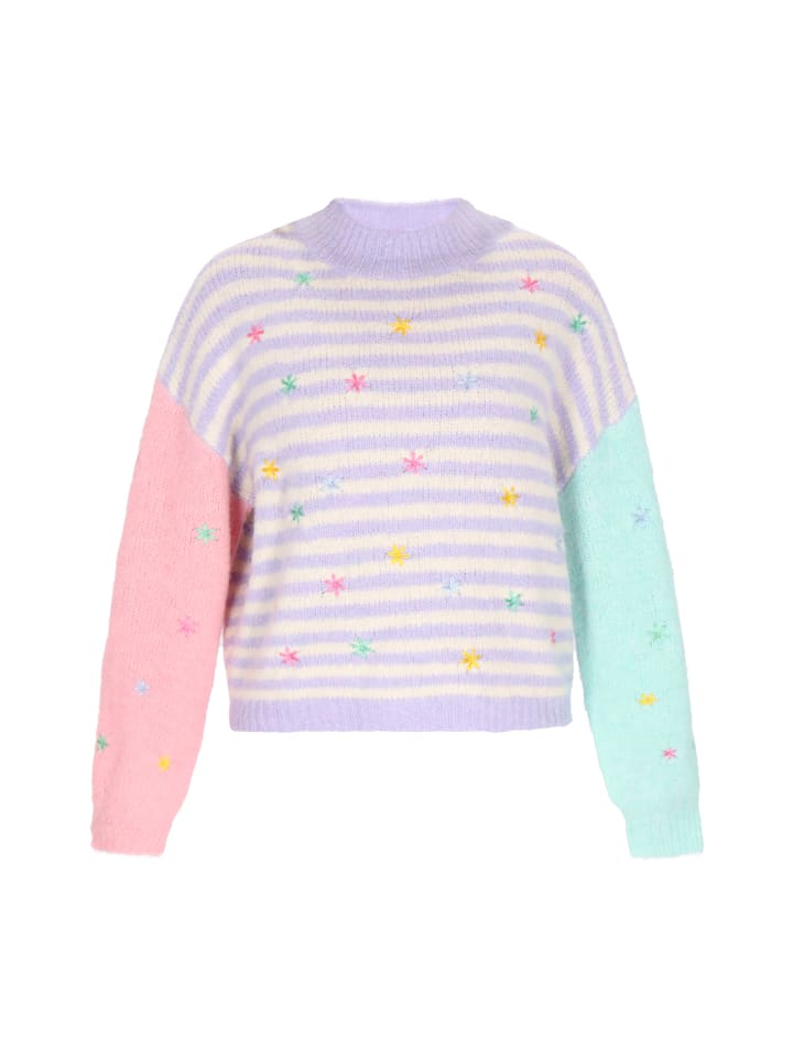 Украсьте свой гардероб этим свободным вязаным свитером из коллекции Young Fashion. Классический круглый вырез, спущенные плечи и объемные рукава-бишоп создают игривый, но в то же время комфортный силуэт. Яркий цветовой блок и полосатый рисунок в сочетании с изящной вышивкой добавляют забавную, привлекательную нотку. Этот удобный и милый свитер идеально подходит для повседневного выхода в свет, он станет вашим незаменимым помощником в создании непринужденного стиля с ноткой индивидуальности.
