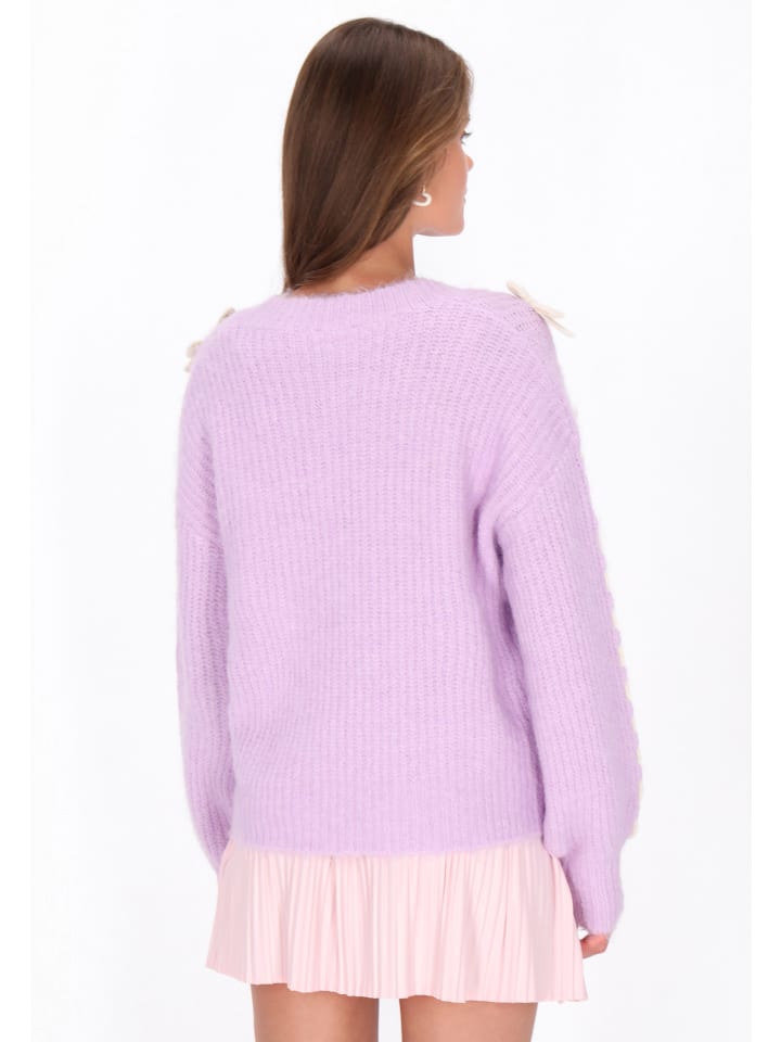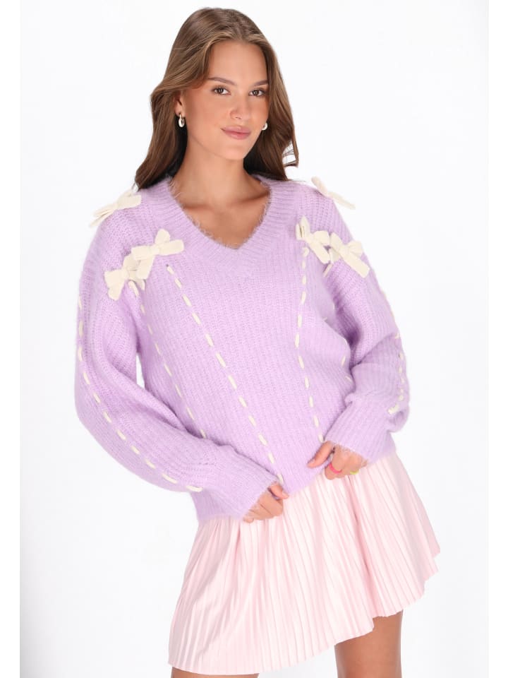 Стильный и очаровательный свитер свободного кроя, идеально подходящий для тех, кто ценит комфорт и молодежный образ. V-образный вырез, длинные рукава-бишоп и спущенные плечи придают этому изделию непринужденный шик. Изготовленный из мягкой трикотажной ткани, он украшен тонким вышитым бантом, придающим ему женственность. Это повседневный, уютный и комфортный вариант, идеально подходящий как для повседневной носки, так и для особых случаев. Этот свитер входит в коллекцию Young Fashion.