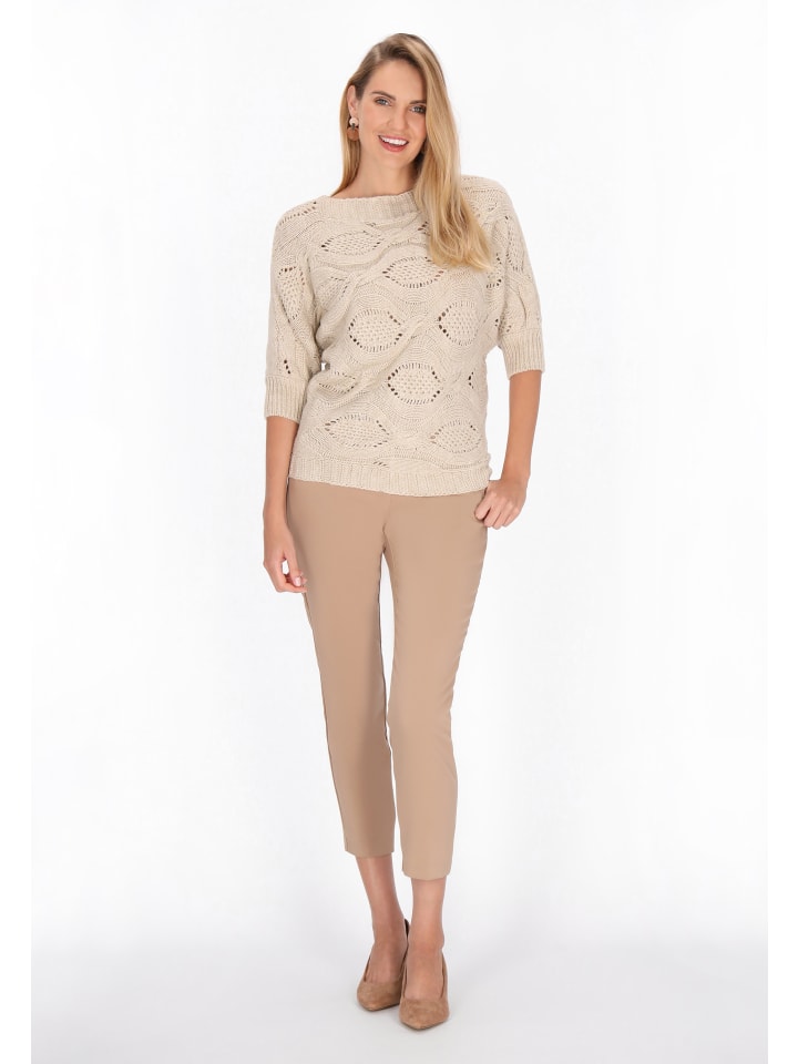Повседневная элегантность на каждый день - свитер из коллекции Fashion Look. Этот вязаный свитер свободного кроя сочетает в себе комфорт и стиль в идеальных пропорциях. Широкий вырез «лодочка» деликатно обнажает линию плеч, а рукава 3/4 с кроем «летучая мышь» добавляют современный, модный штрих. Он отличается фактурным узором, который придает общему образу интересный эффект и легкость. Отличный выбор для повседневного образа - удобный, женственный и стильный. Прекрасно сочетается как с брюками строгих кроев, так и с юбками с высокой талией.