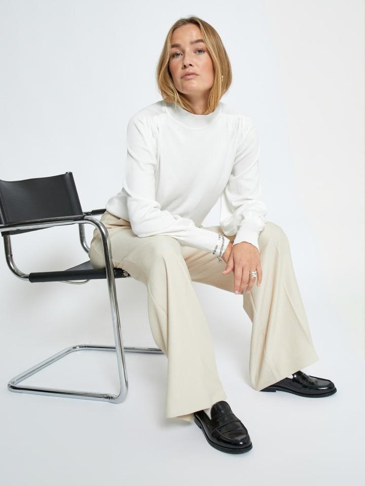 Свитер MSIlma изготовлен из смеси Eco Vero и эластана, что делает его мягким и эластичным. Eco Vero - это экологичная альтернатива вискозе. У свитера длинные рукава, высокий воротник и едва заметные складки на плечах. Широкие манжеты, воротник и подол в рубчик завершают образ.