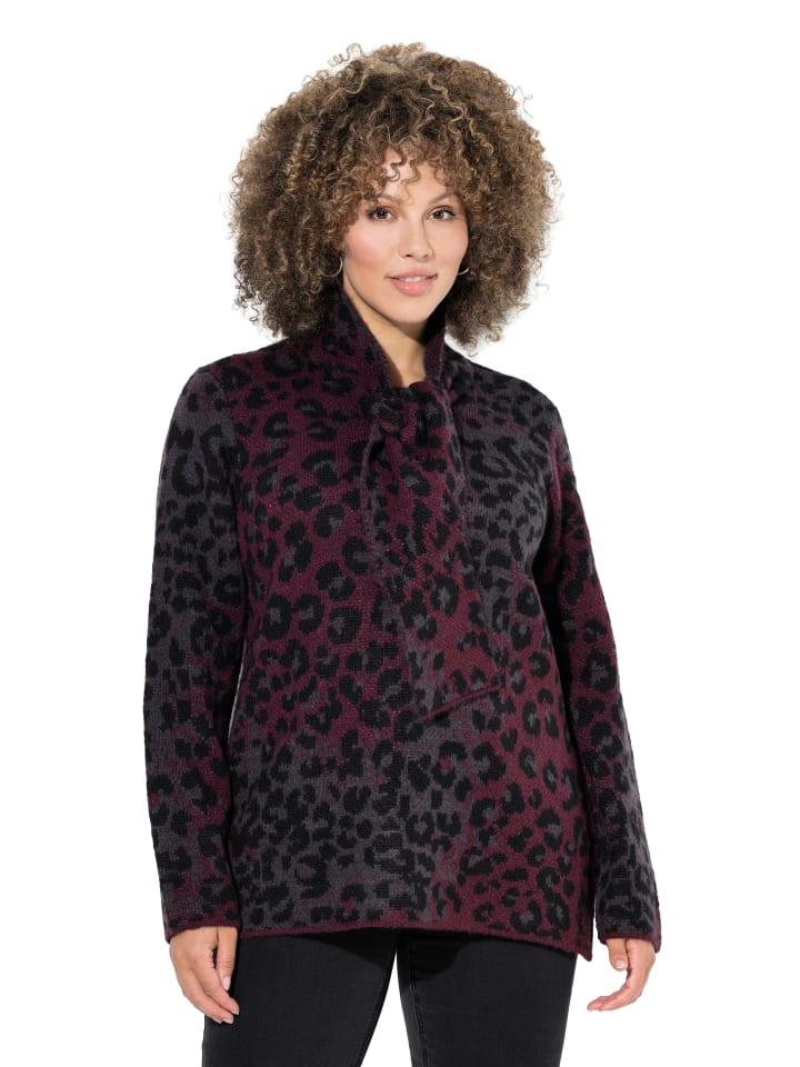 Свитер классического кроя из мягкой пряжи с леопардовым принтом. Изюминкой является вырез с шарфом. Длинные рукава, гладкие манжеты.
