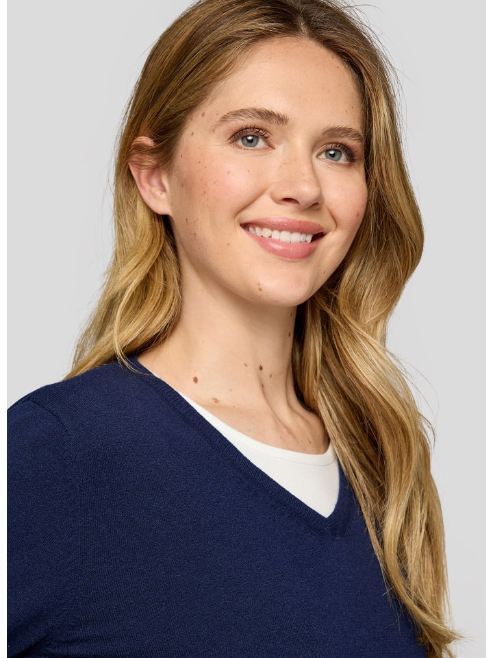 Этот универсальный свитер с женственным V-образным вырезом - стильная универсальная вещь на каждый день. Тонкая вязка обеспечивает элегантный вид, а мягкая ткань обеспечивает комфорт при ношении. Широкие ребристые манжеты и подол дополняют дизайн. Доступен в темно-синем или бирюзовом цвете - идеально подходит для сочетания с джинсами или брюками. Классический V-образный вырез. Мягкая ткань. Широкие ребристые манжеты и подол.