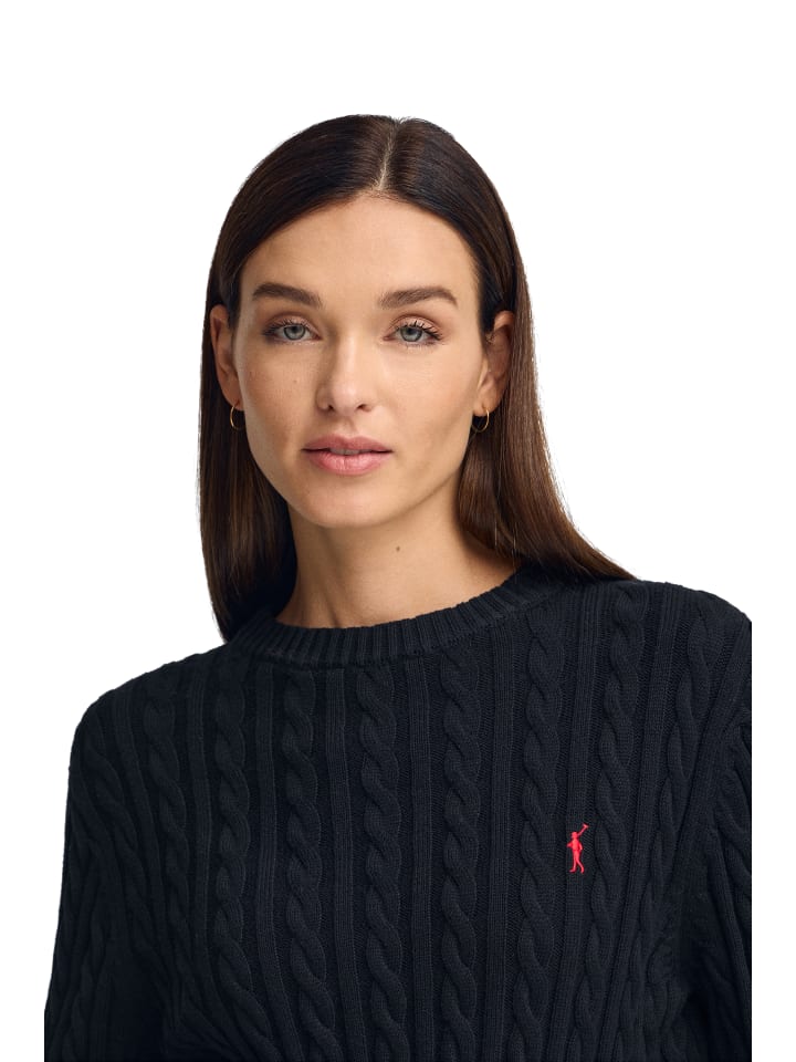 Женский свитер прямого кроя с длинными рукавами, круглым вырезом. Изготовлен из смеси шерсти и хлопка, с узором «косички». Удобный и неподвластный времени предмет одежды.