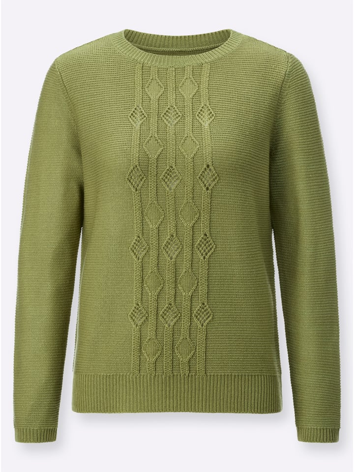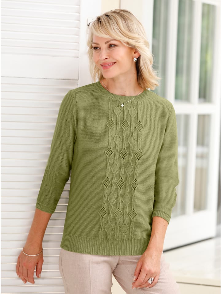 Удивительно удобного качества: свитер с характерным сочетанием фактурных и ажурных узоров спереди. Модный вид изнаночной вязки. Ребристые манжеты, замысловато связанные для придания формы.