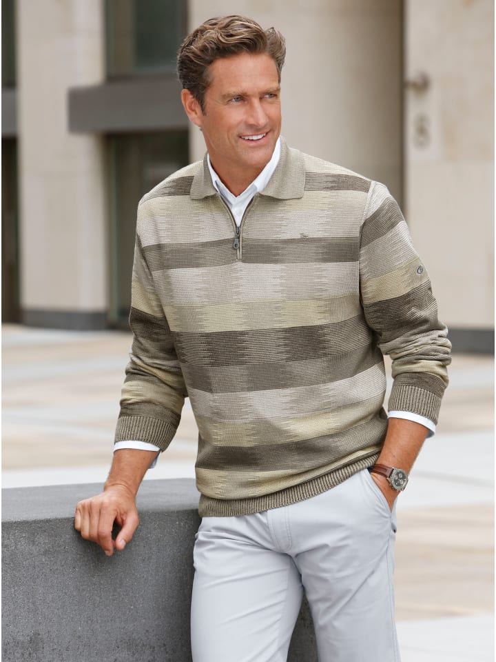 Легкий, воздушный свитер из высококачественного льна. Воротник-поло на молнии. Ребристые манжеты и низ обеспечивают идеальную посадку, а гармоничный узор вязки создает привлекательный вид.